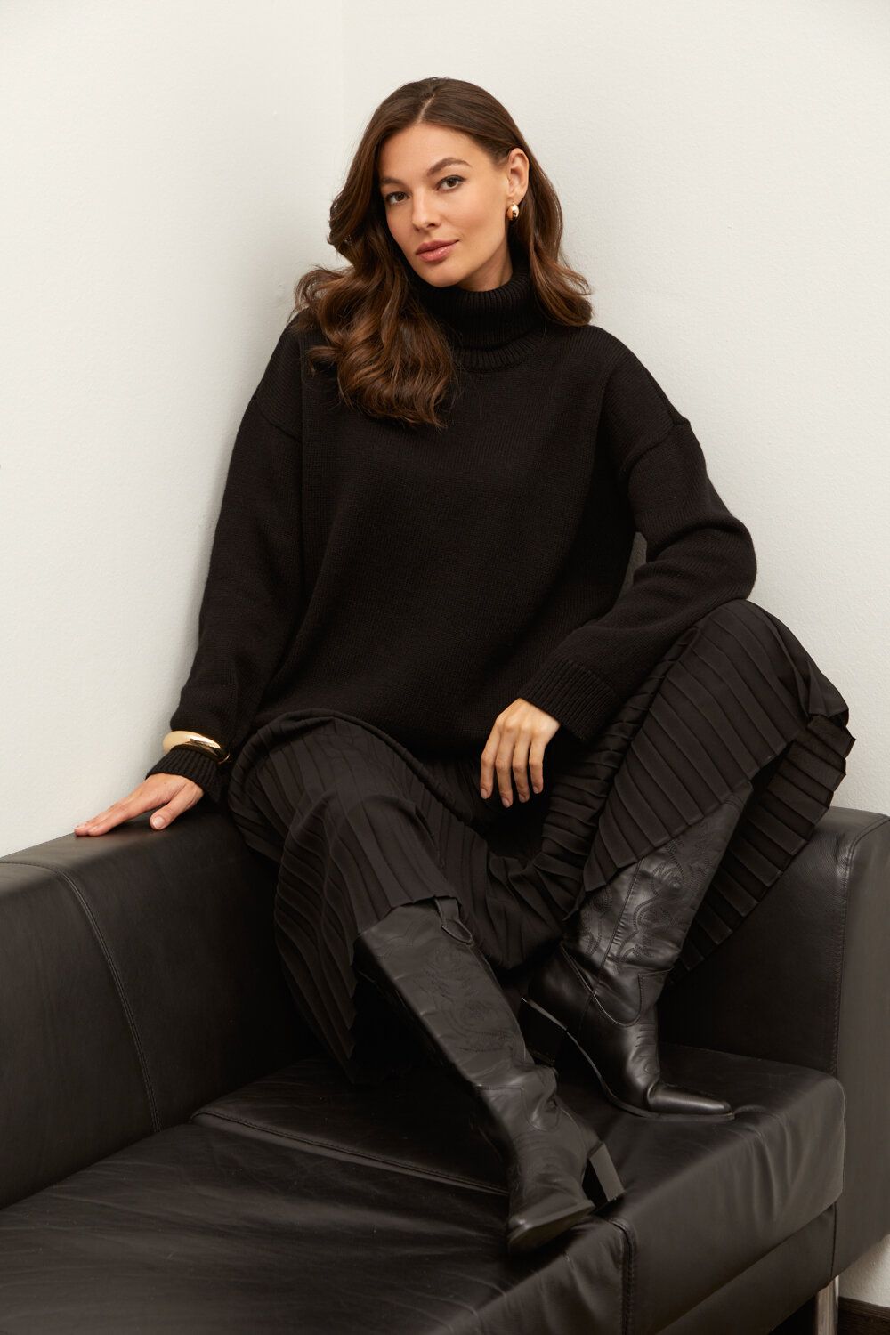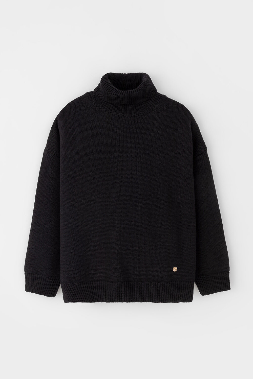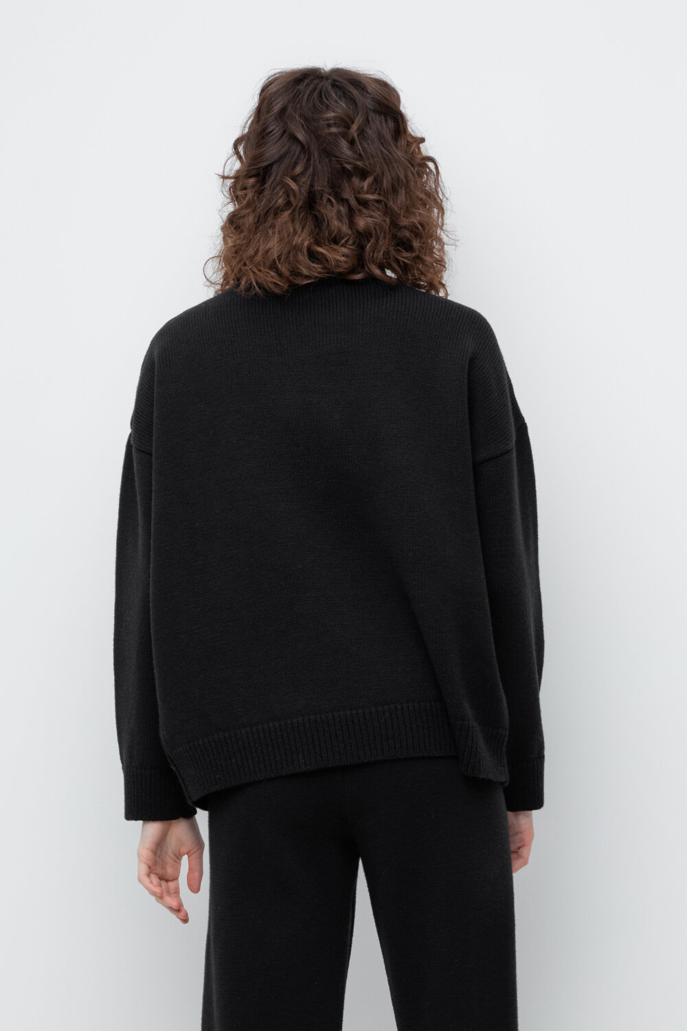 Уютный вязаный джемпер из полушерстяной пряжи. Шерсть в составе сохраняет тепло, а волокна акрила добавляют мягкость и объем. Выполнен гладью. Комфортная длинные цельнокроеные рукава придают изделию объем.