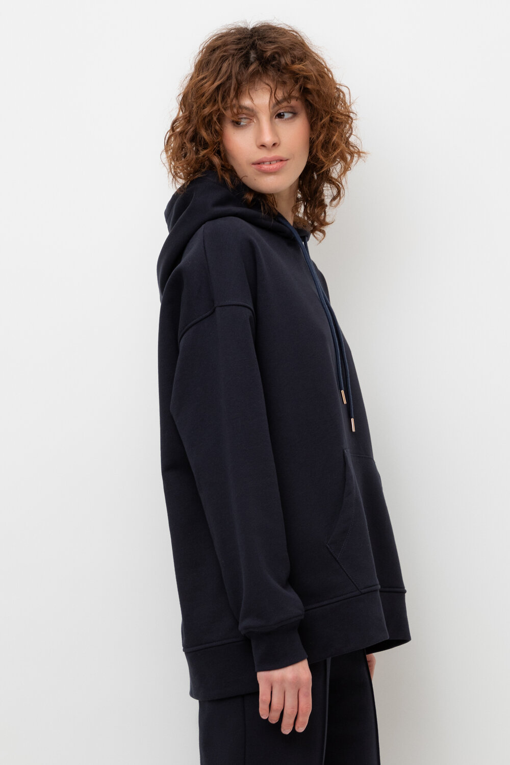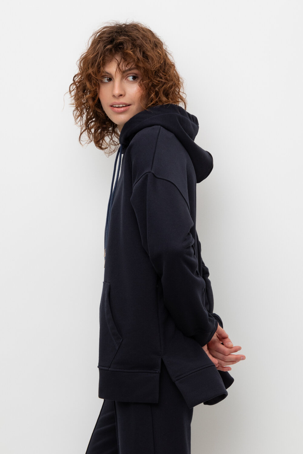 Трикотажная толстовка-оверсайз из петельчатого футера трехнитки. Капюшон регулируется с помощью шнура. У изделия свободная посадка, карман-кенгуру, эластичные манжеты. По бокам разрезы. Гладкий и плотный материал на основе хлопка сохраняет форму.