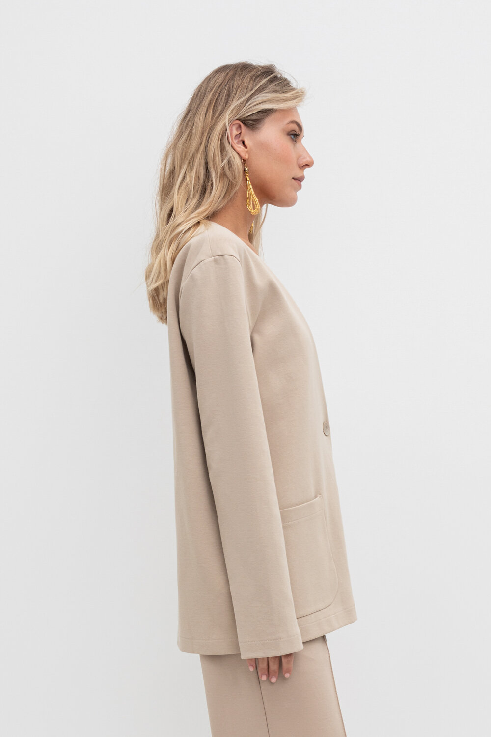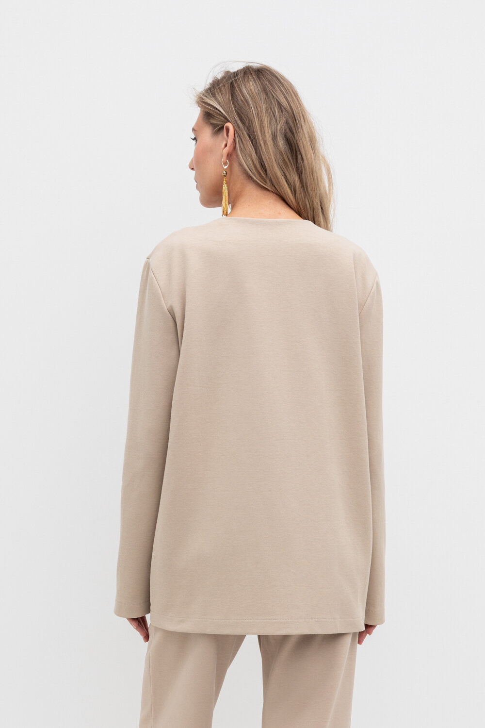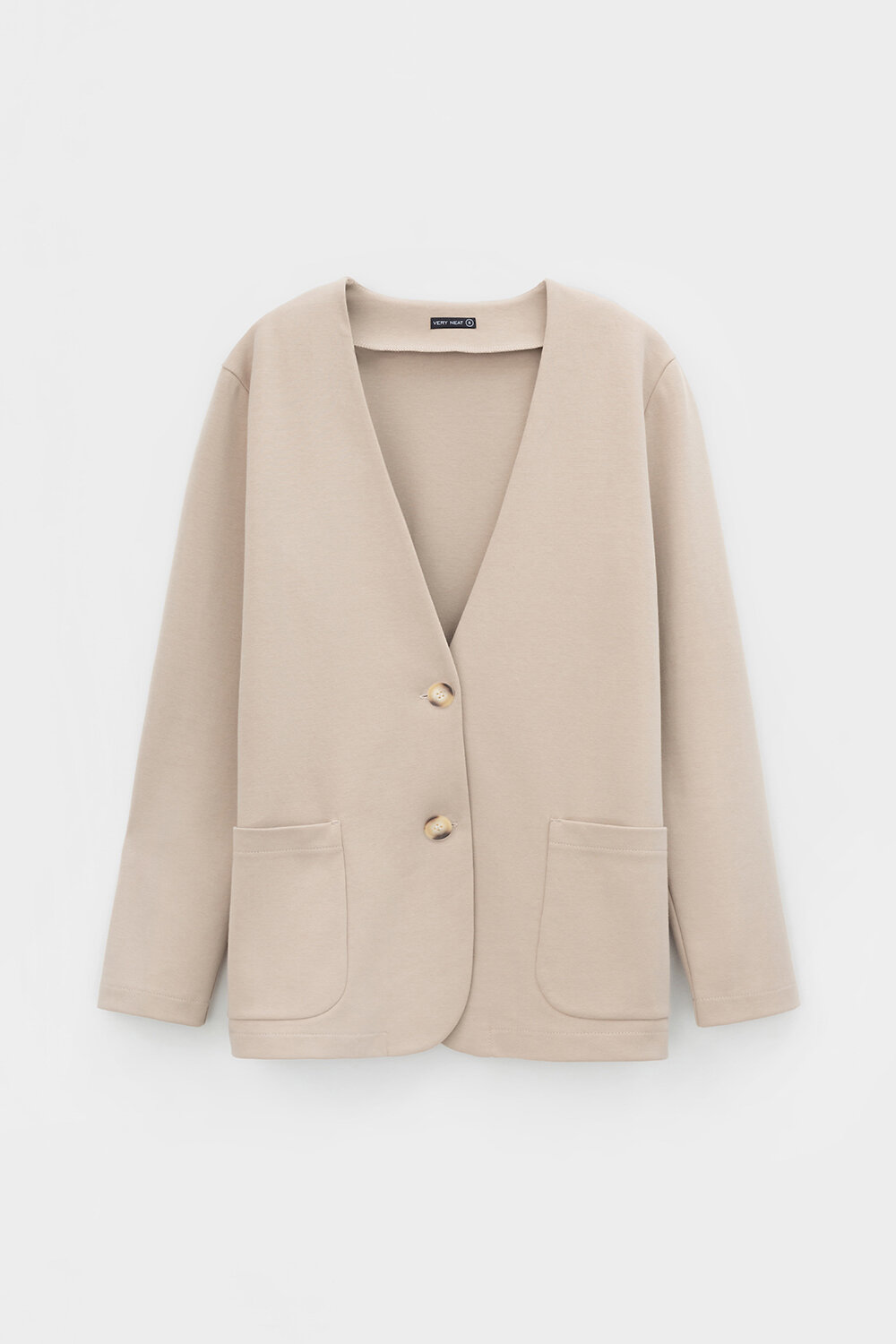 Однобортный, прямой немного удлиненный жакет с застежкой на пуговицы и двумя накладными карманами. Все трикотажные изделия производятся в соответствии с нормами Швейцарского сертификата ЭкоТекс. Сделано в России