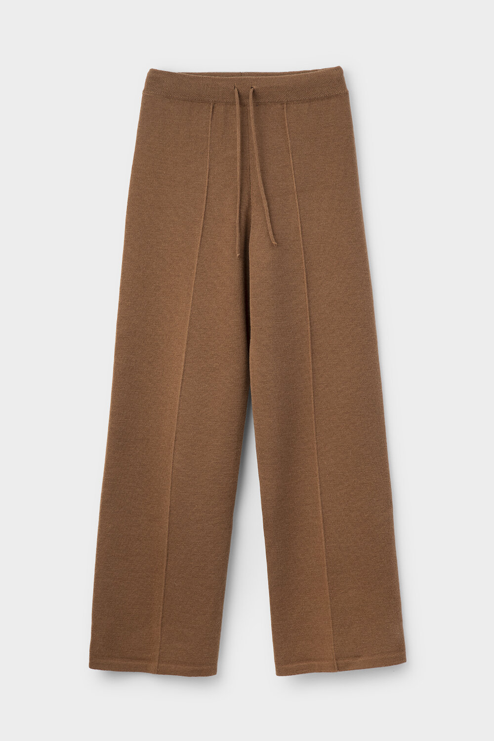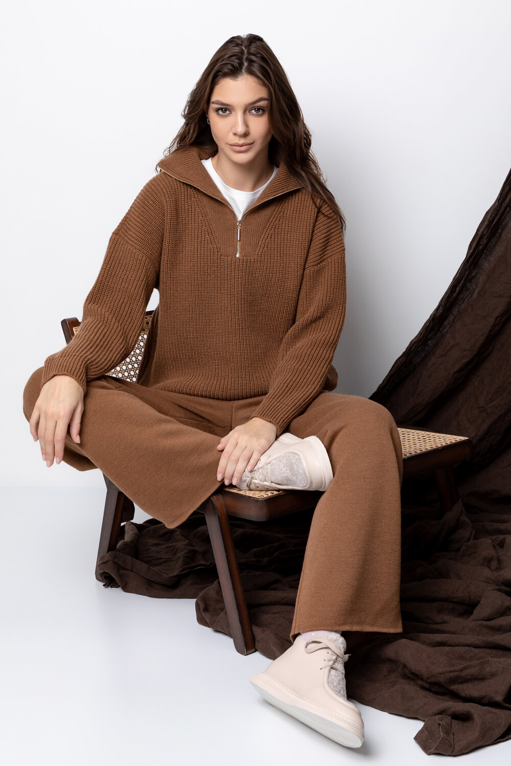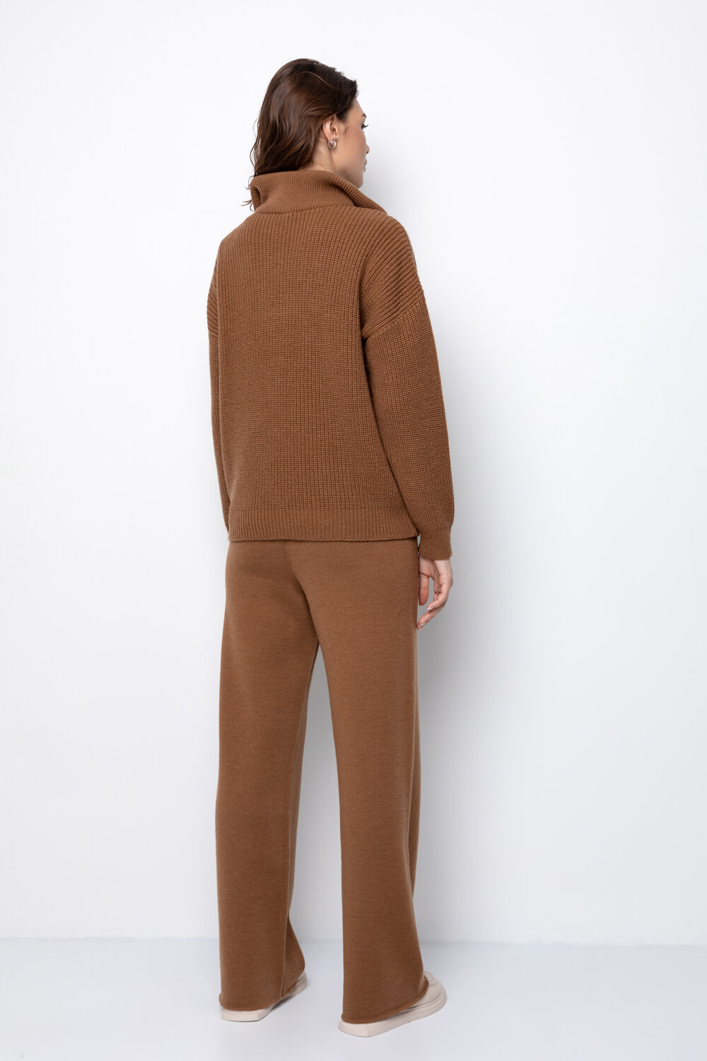 Удобные вязаные брюки прямого силуэта с поясом на резинке и стрелками. Связаны из мягкой полушерстяной пряжи. В составе 50% шерсти и 50% акрила. Шерсть в составе сохраняет тепло, а благодаря волокнам акрила изделие мягкое и дольше сохраняет форму.