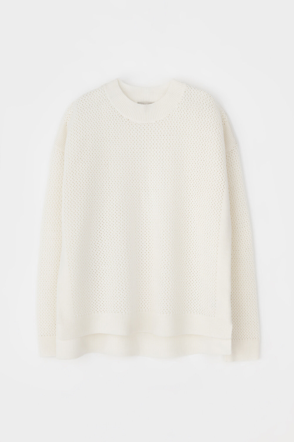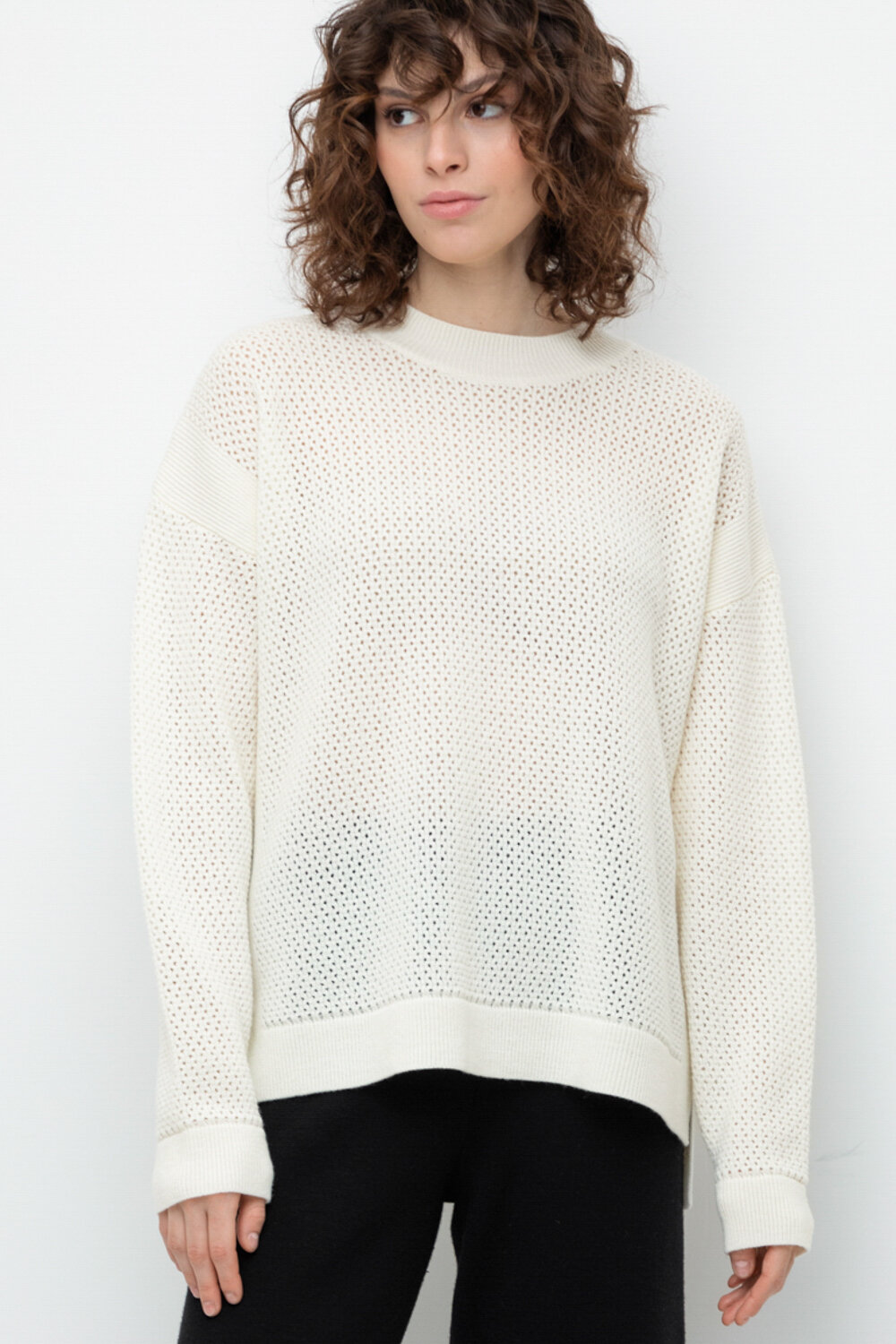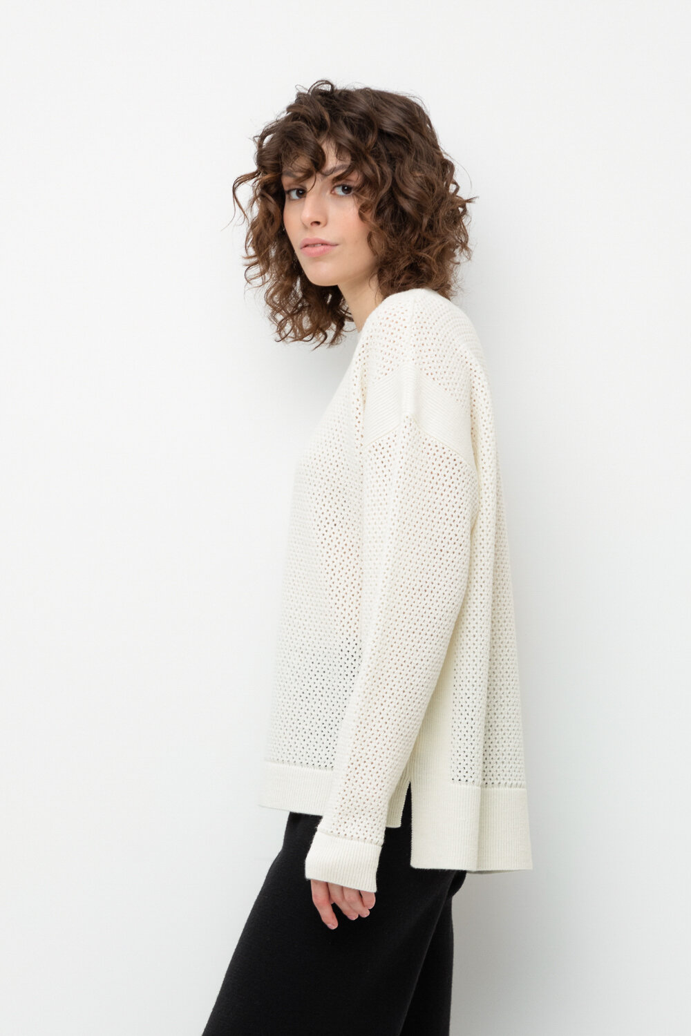 Джемпер с удлиненной спинкой и разрезами по бокам связан ажурной вязкой "волна". Средняя плотность вязания и пластичная фактура сохраняют форму изделия.