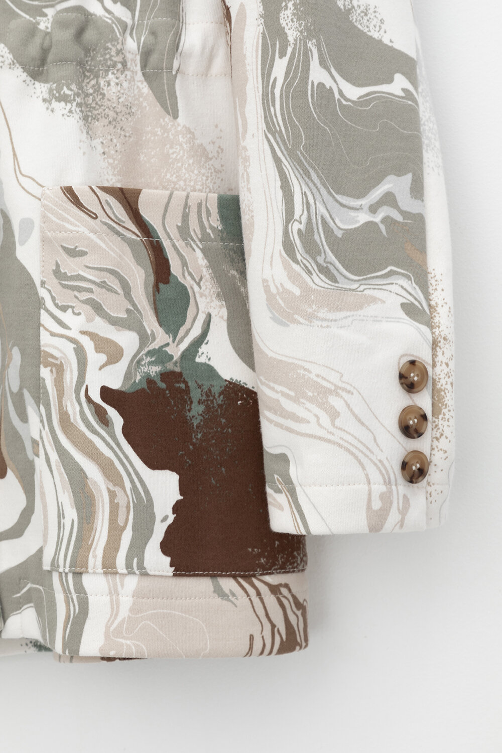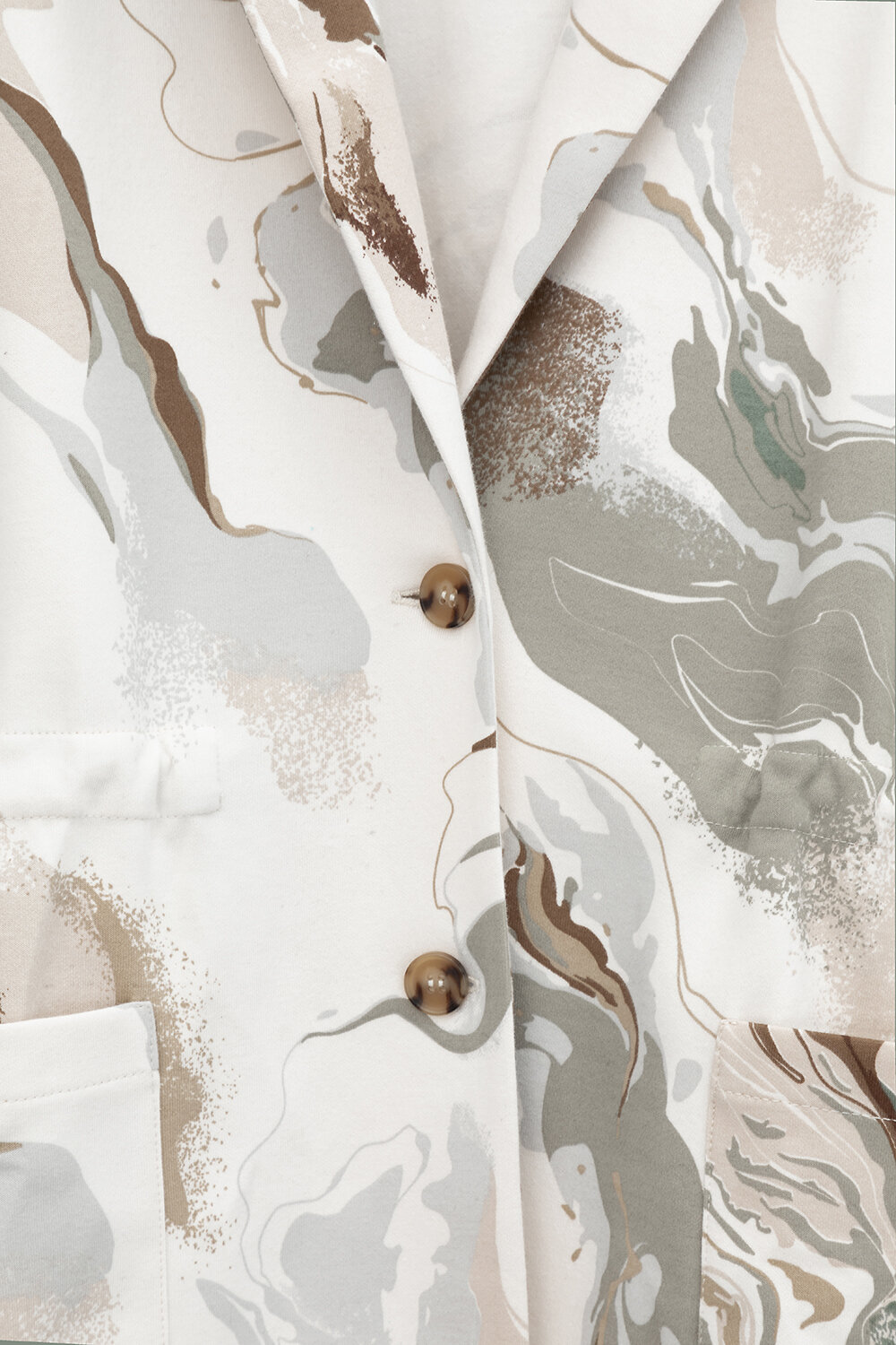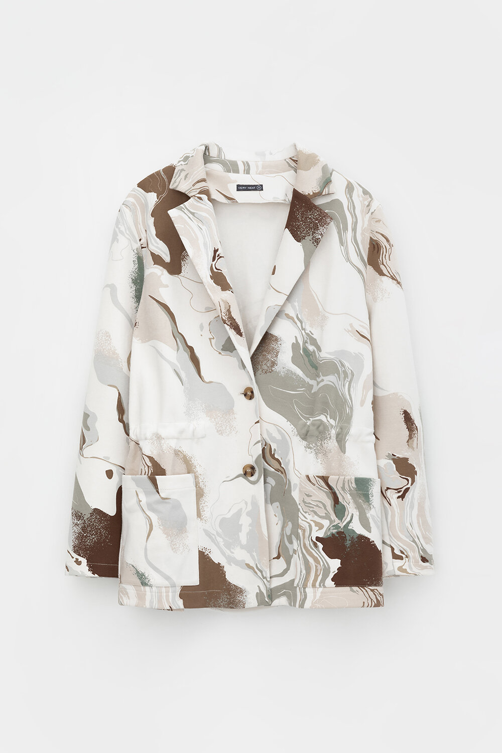 Женский жакет прямого кроя с карманами и кулиской из плотного набивного гладкого трикотажа интерлок. Гладкий и плотный материал на основе хлопка сохраняет форму.