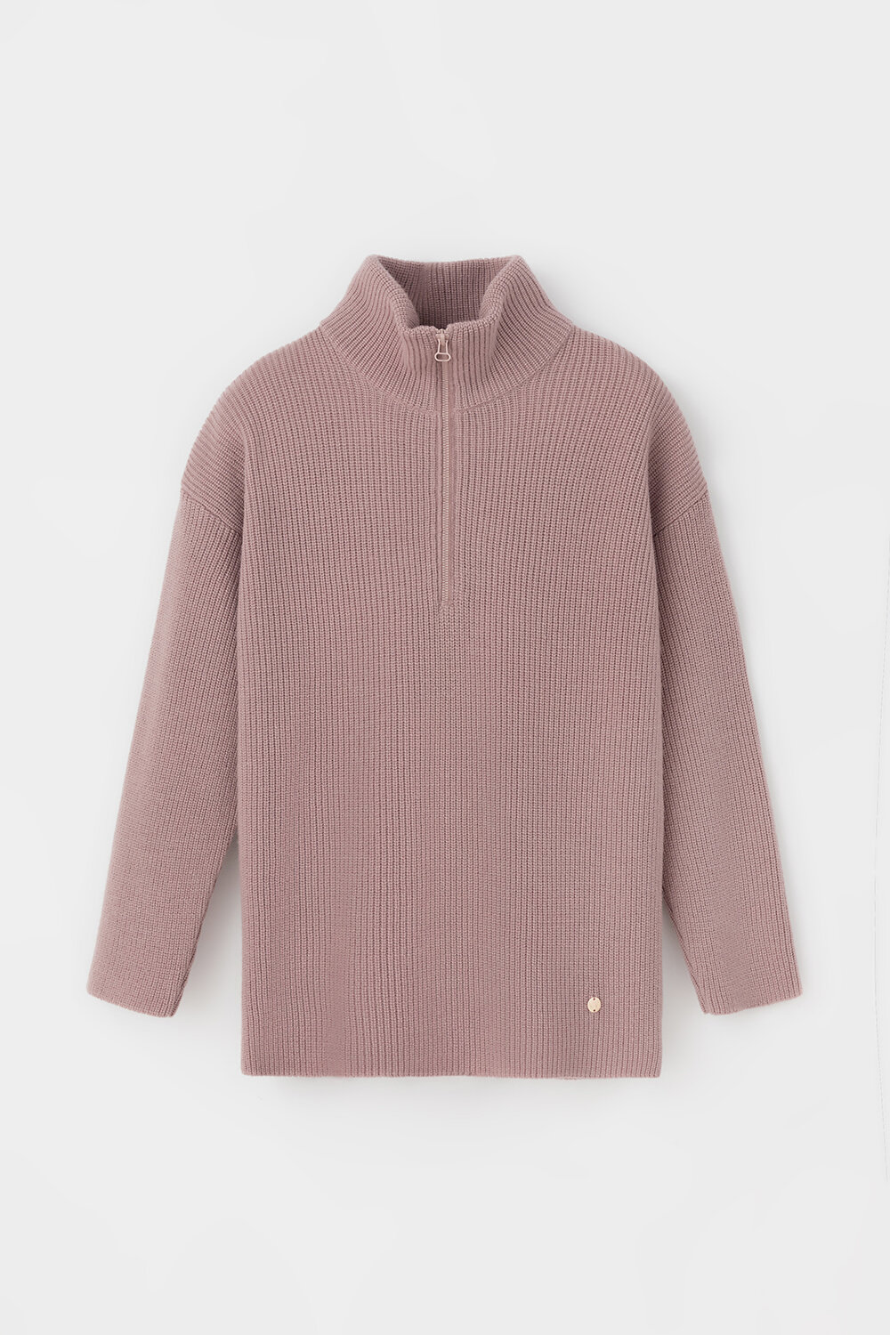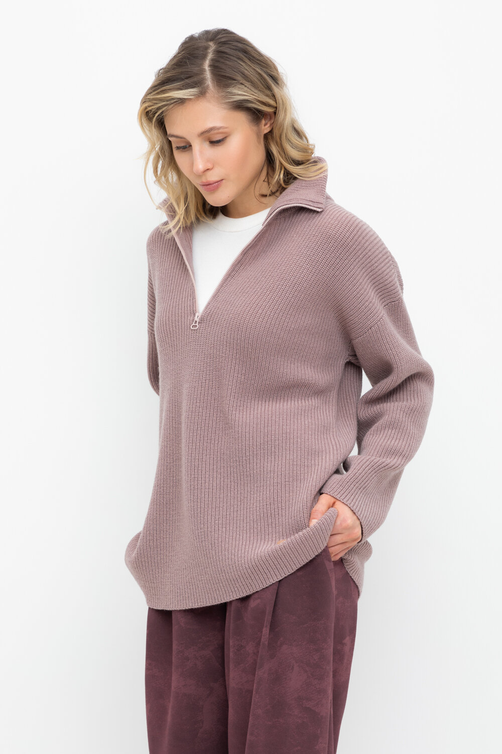 Уютный джемпер в стиле оверсайз со спущенным плечом и объемными рукавами из полушерстяной пряжи. Воротник-стойка застёгивается на молнию.