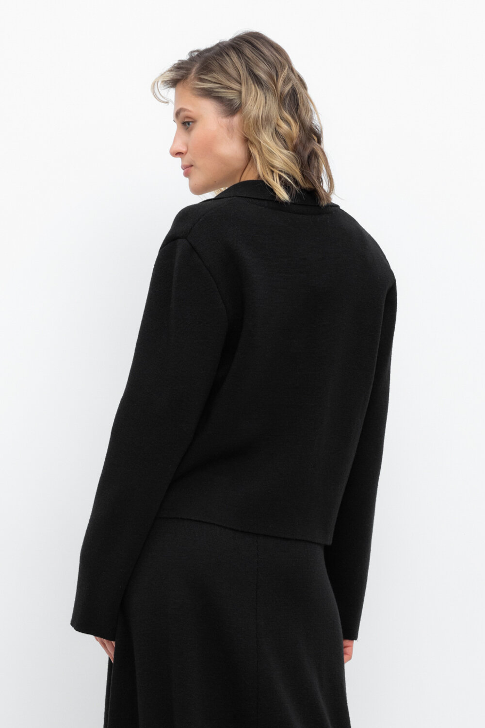 Женский укороченный жакет прямого кроя с имитацией карманов с клапаном, связан комбиниркой. Шерсть мериноса в составе сохраняет тепло, акрил делает изделие мягким. Прямой силуэт идеально подходит как к юбке, так и к брюкам.
