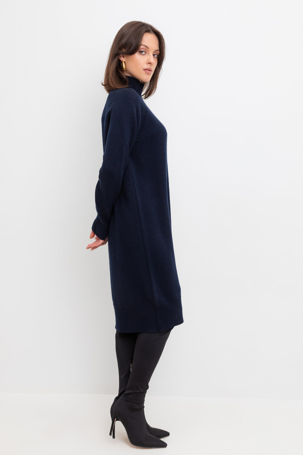 Вязаное платье длины миди с длинными рукавами реглан из полушерсти. Выполнено гладью. Прямой силуэт хорошо садится по фигуре. Манжеты и низ изделия вывязаны широкой резинкой, благодаря которой края не растягиваются.