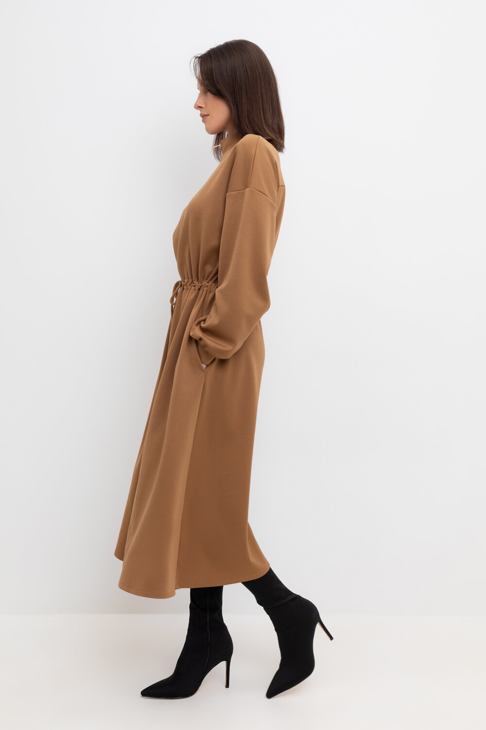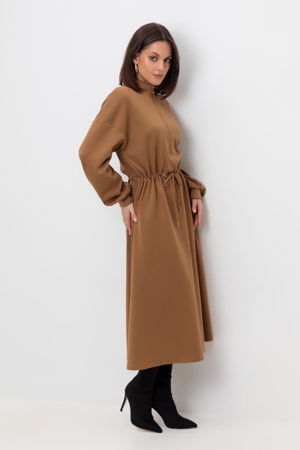 Платье с кулиской из плотного гладкого трикотажа интерлок с застежкой на молнию. Кулиска по линии талии подчеркивает женственность пропорций. Шнурок с наконечниками для утяжки служит украшением. Спущенное плечо придает изделию свободный силуэт.