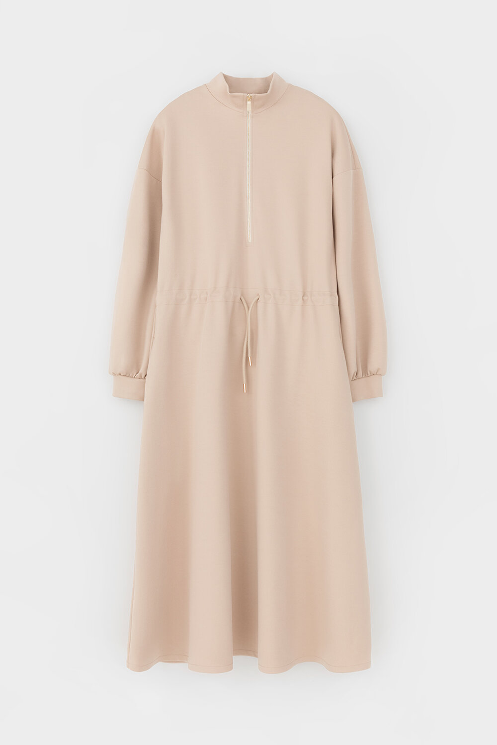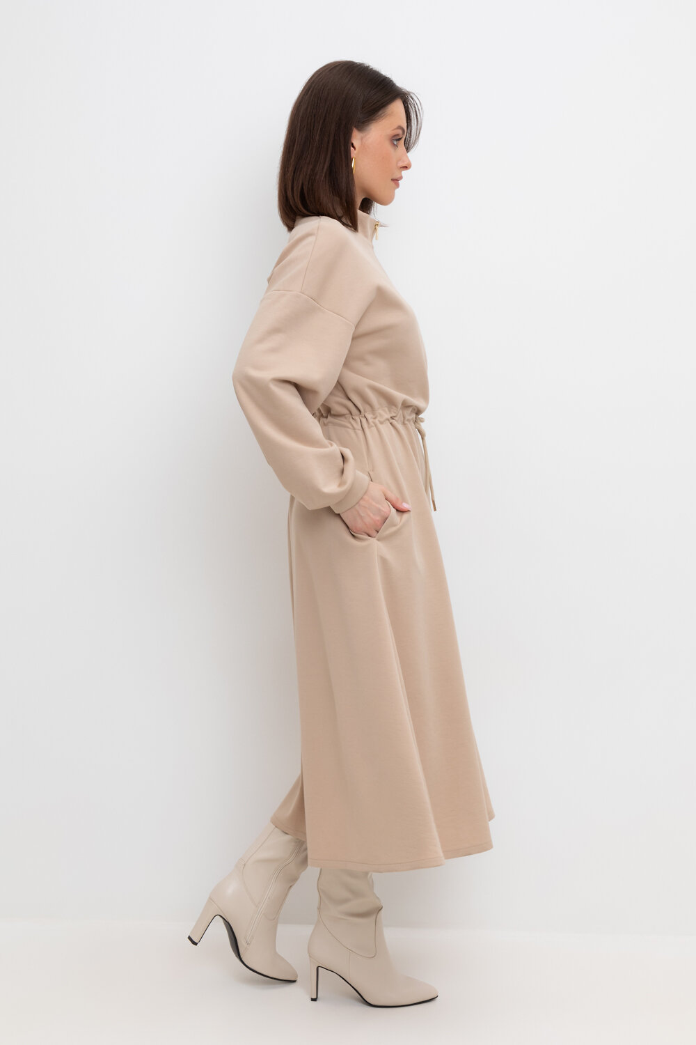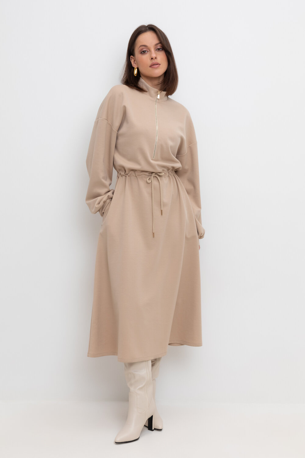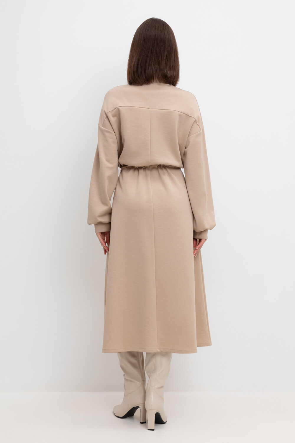Платье с кулиской из плотного гладкого трикотажа интерлок с застежкой на молнию. Кулиска по линии талии подчеркивает женственность пропорций. Шнурок с наконечниками для утяжки служит украшением. Спущенное плечо придает изделию свободный силуэт.