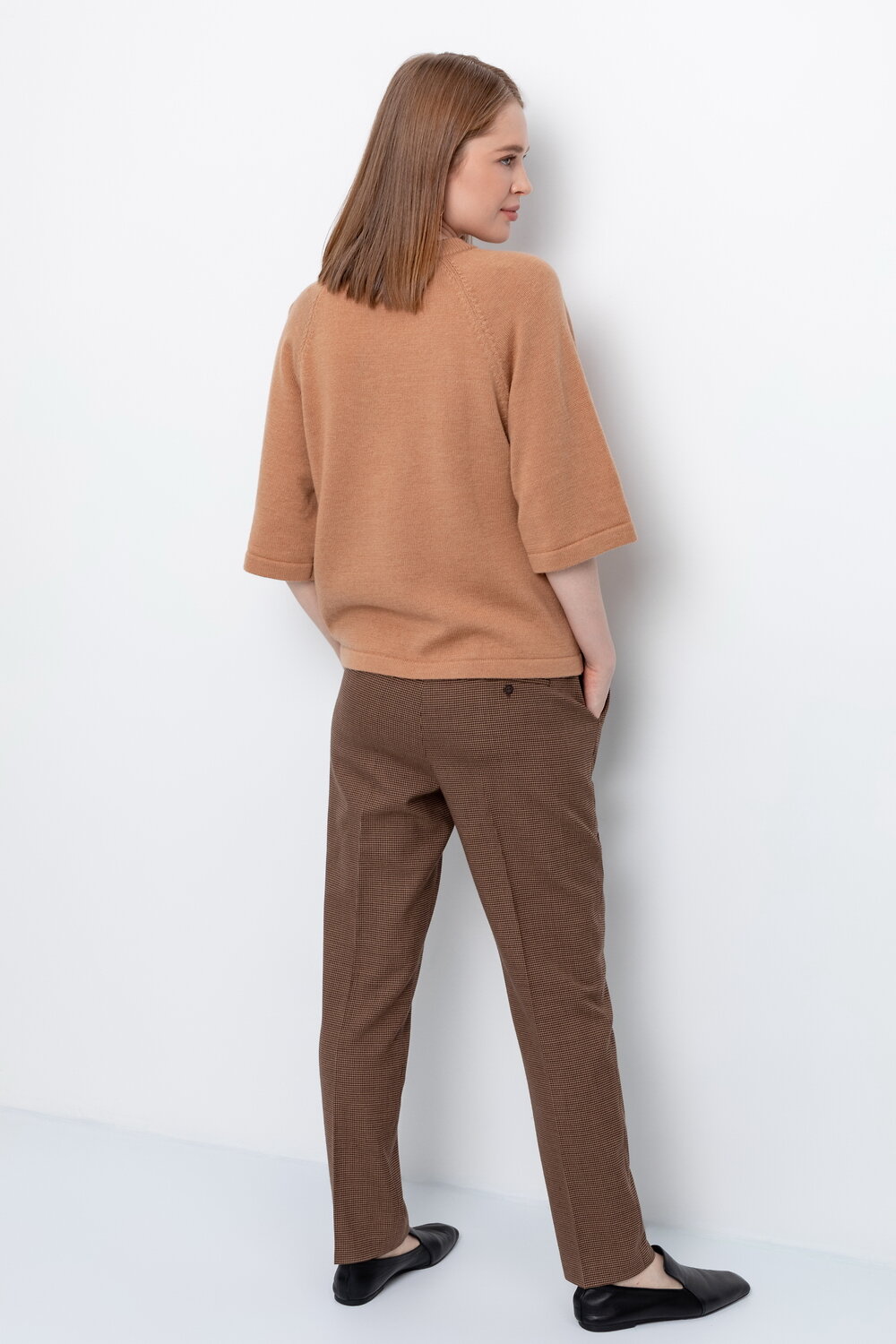 Брюки из костюмной ткани с добавлением шерсти с узором "гусиная лапка" прямого силуэта, слегка зауженные книзу с боковыми карманами и заутюженными стрелками. Комфортый пояс на резинке. Застегивается спереди на молнию и брючный крючок.