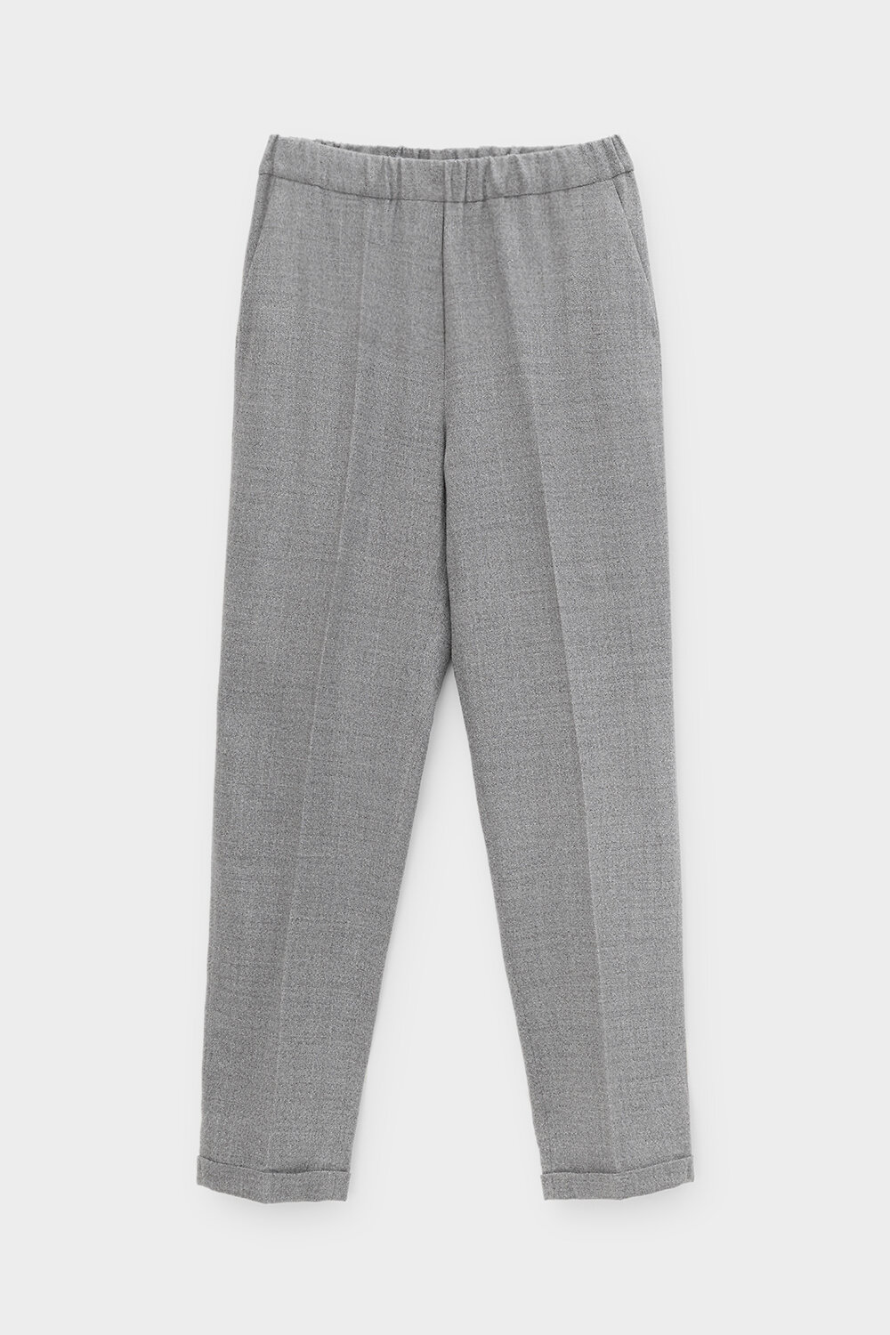 Брюки из мягкой меланжевой ткани с добавлением шерсти прямого силуэта, слегка зауженные книзу, с боковыми карманами, заутюженными стрелками и подворотами. Комфортый пояс на резинке.
