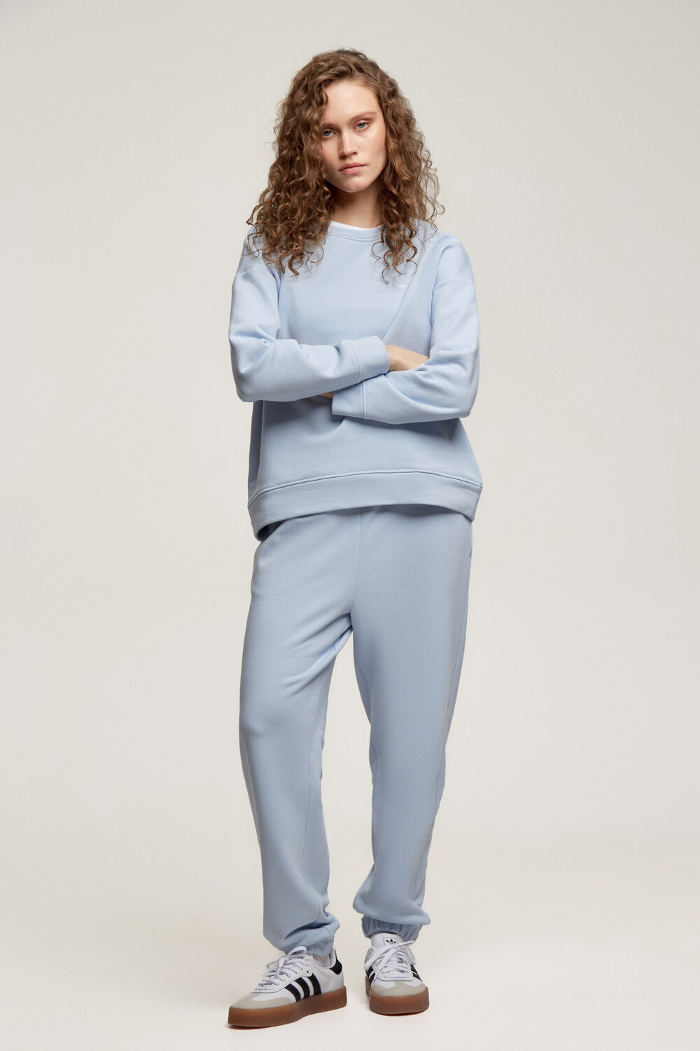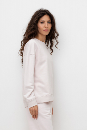 Объемный свитшот из двухцветного трикотажного футера. Внутренняя сторона изделия представлена в натуральном цвете хлопка, внешняя в нежно-голубом. За счет использования крашенной пряжи, данный вид полотна прошел минимальную обработку, что придало изделию мягкость и шелковистость.