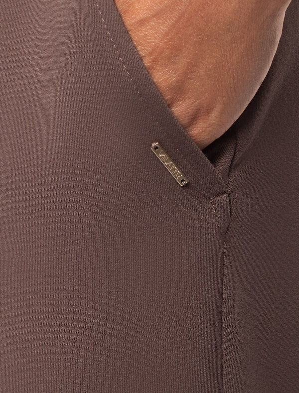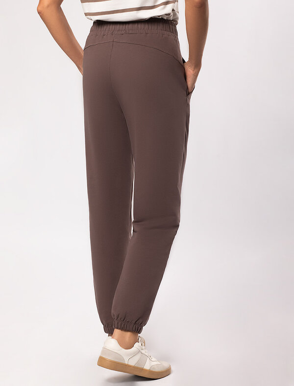 Брюки выполнены из эластичного футера двухнитки. Изделие дополнено боковыми карманами с фирменным логотипом бренда. Пояс на резинке регулируется потайным хлопковым шнурком. Эластан в составе гарантирует комфорт и формоустойчивость. Модель сочетается в костюме с свитшотом D49.072 и паркой D49.076