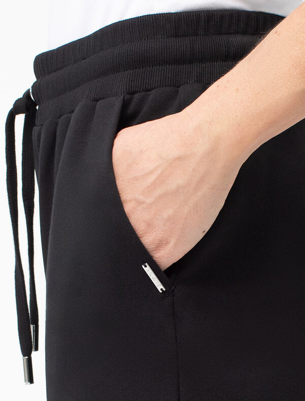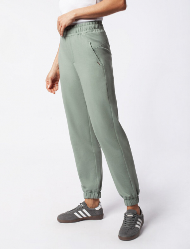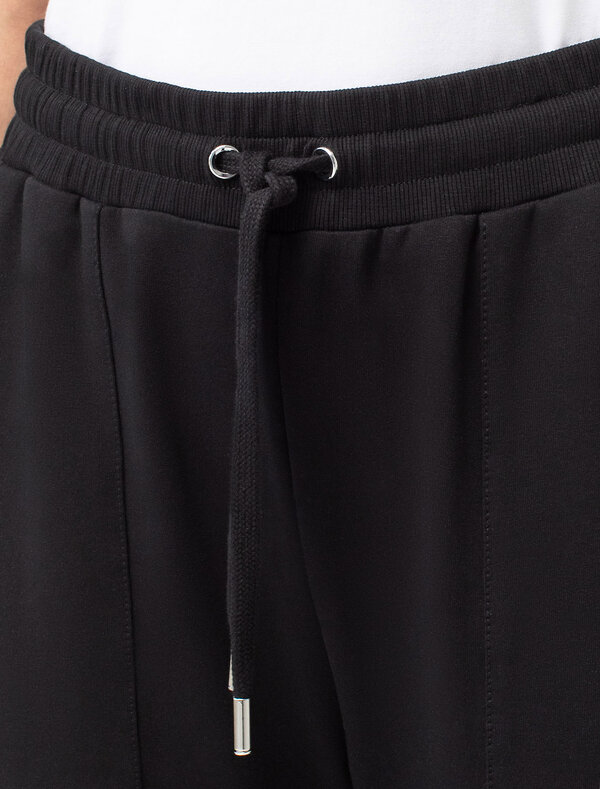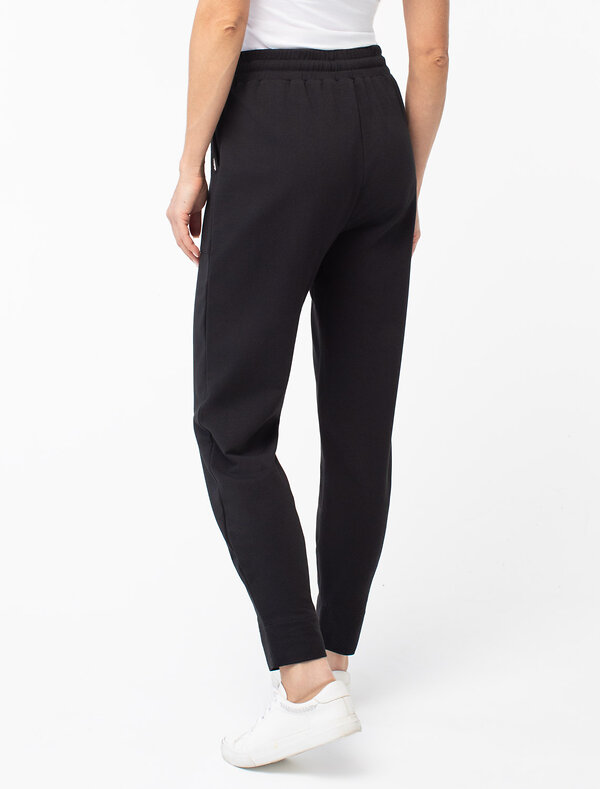 Брюки выполнены из футера двухнитки с эластаном. Модель зауженная к низу дополнена карманами и эластичным поясом с фактурой в рубчик. В пояс вставлен плоский хлопковый шнур в тон изделия с золотистыми наконечниками. Изделие дополнено металлическим логотипом бренда. Сочетается в костюме с жакетом D49.078, джемпером D49.079, D49.080 и футболкой D49.081