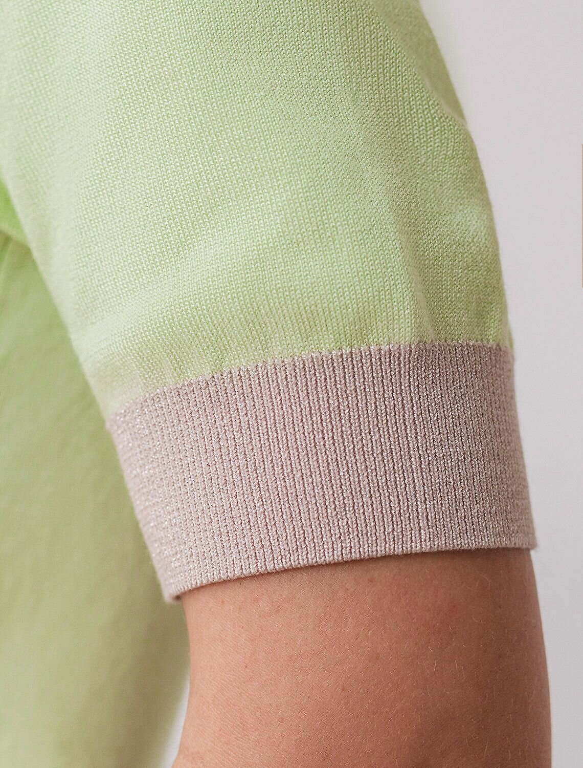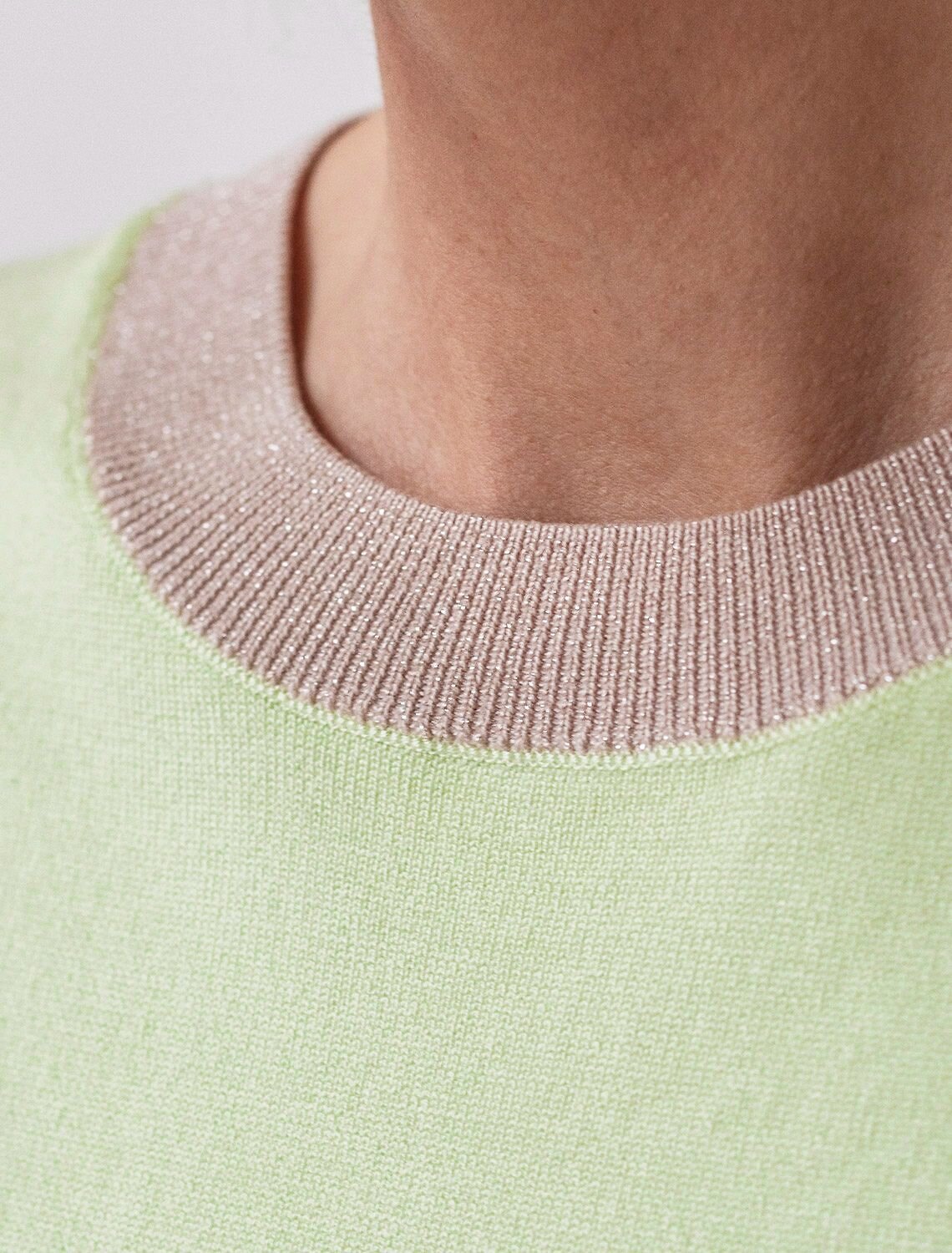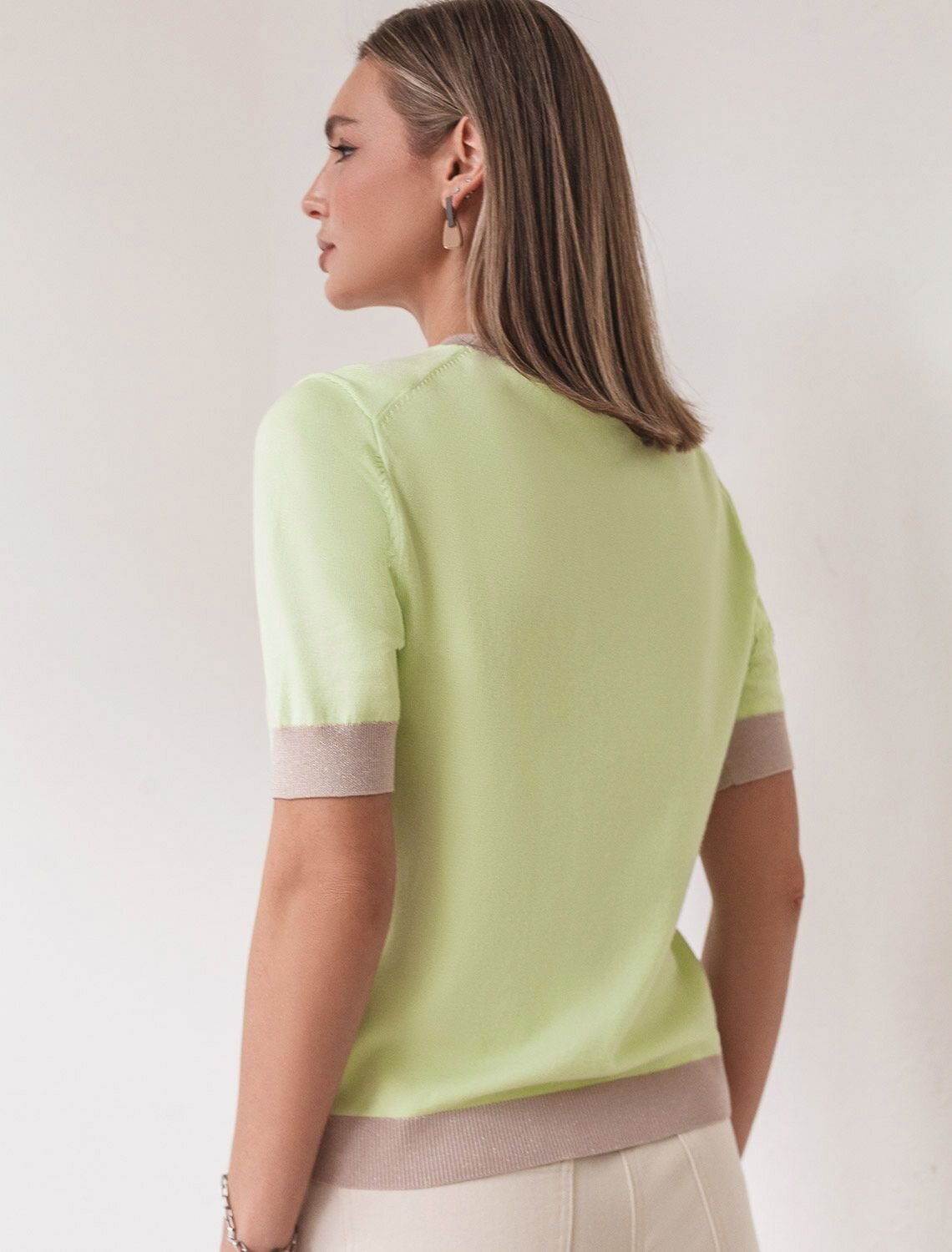 Легкий джемпер светло-зеленого цвета с круглым вырезом идеально подходит на весну и лето. Тонкая вязка из вискозы дарит приятный комфорт и ощущение свежести в теплую погоду. Полуприлегающий крой подчеркивает силуэт, а универсальная длина позволяет сочетать джемпер с разными элементами гардероба. Контрастная отделка с мягким люрексом добавляет стильный акцент, создавая выразительный образ. Деликатное мерцание придает праздничное настроение, но не выглядит слишком ярко или вызывающе. Такой элемент украшения позволяет носить нарядный джемпер и на особых мероприятиях. Джемпер отлично смотрится на больших размерах благодаря продуманному крою и полуприлегающему фасону. Этот джемпер с коротким рукавом станет незаменимой частью гардероба в сезоны, когда хочется легкости и элегантности одновременно. Лаконичный дизайн обеспечивает простоту комбинирования с другими вещами и будет универсальной базой для создания разнообразных комплектов — от офисного до непринужденного городского стиля.