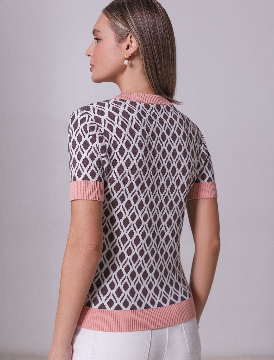 Джемпер с коротким рукавом жаккардовой вязки — универсальная и стильная вещь для весны и лета. Джемпер кофейно-белого цыета выполнен из приятной к телу вискозы, которая дарит ощущение комфорта даже в теплую погоду, а качественная жаккардовая вязка сохраняет форму после стирки. Контрастная отделка гармонично сочетается с выразительным геометрическим рисунком, который придает образу индивидуальность и современность. Принт немного напоминает благородный орнамент аргайл. Вискоза Джемпер отлично смотрится на больших размерах благодаря продуманному крою и полуприлегающему фасону. Этот джемпер с коротким рукавом станет незаменимой частью гардероба в сезоны, когда хочется легкости и стиля одновременно.