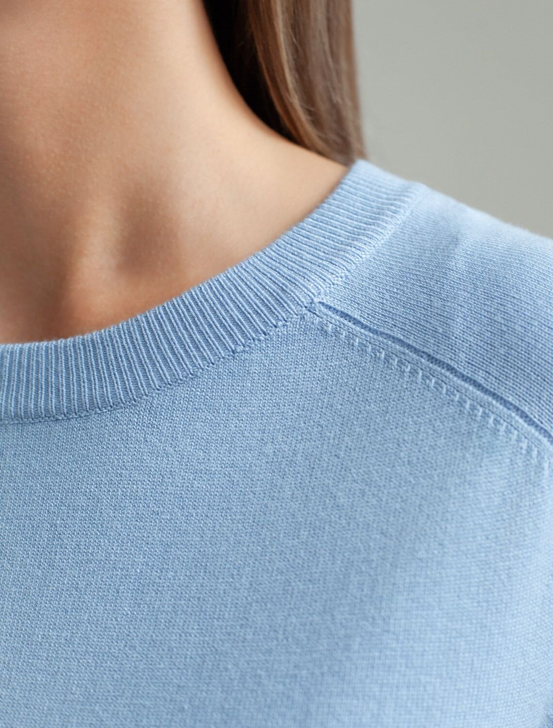 Легкий свободный джемпер светло-голубого цвета с круглым вырезом идеально подходит на весну и лето. Тонкая вязка из вискозы дарит приятный комфорт и ощущение свежести в теплую погоду. Универсальная длина позволяет сочетать джемпер с разными элементами гардероба. Джемпер отлично смотрится на больших размерах благодаря продуманному крою и свободному фасону. Широкие рукава создают воздушность и делают силуэт особенно женственным. Этот джемпер с рукавом 3/4 станет незаменимой частью гардероба в сезоны, когда хочется легкости и элегантности одновременно. Лаконичный дизайн обеспечивает простоту комбинирования с другими вещами и будет универсальной базой для создания разнообразных комплектов — от офисного до непринужденного городского стиля.