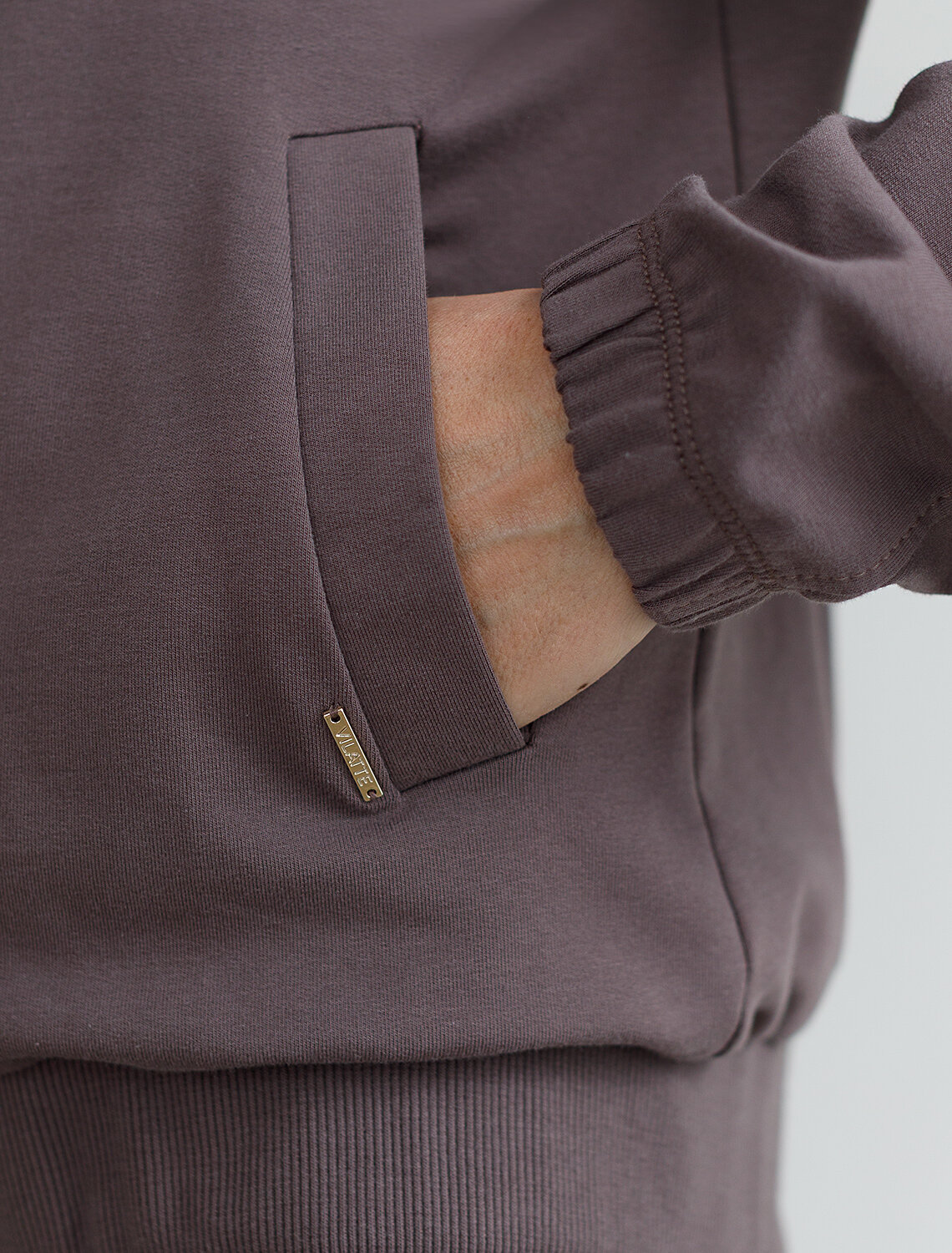 Бомбер кофейного цвета среднего объема на молнии с карманами из премиального футера двухнитки — это стильный выбор для ценительниц минимализма и комфорта. Натуральный состав обеспечивает дышащий эффект, мягкость и приятные тактильные ощущения, Эластичный материал позволяет свободно двигаться без лишнего стеснения, а также отлично сохраняет форму даже после длительного ношения. Манжеты на рукавах и резинка по низу обеспечивают надежную посадку, сохраняя тепло в прохладную погоду. Повседневный бомбер отличается аккуратным силуэтом без лишнего объема и универсальной длиной, которая идеально подходит для повседневного и спортивного образа. Прорезные карманы по бокам добавляют функциональности, сохраняя при этом стильный внешний вид. Бомбер из футера украшен деликатной вышивкой в виде эмблемы бренда, которая придает особый шарм и подчеркивает индивидуальность владелицы. Такой изысканный элемент декора гармонично сочетается с лаконичным дизайном, отвечая современным тенденциям моды. Так же на одном из карманов рас