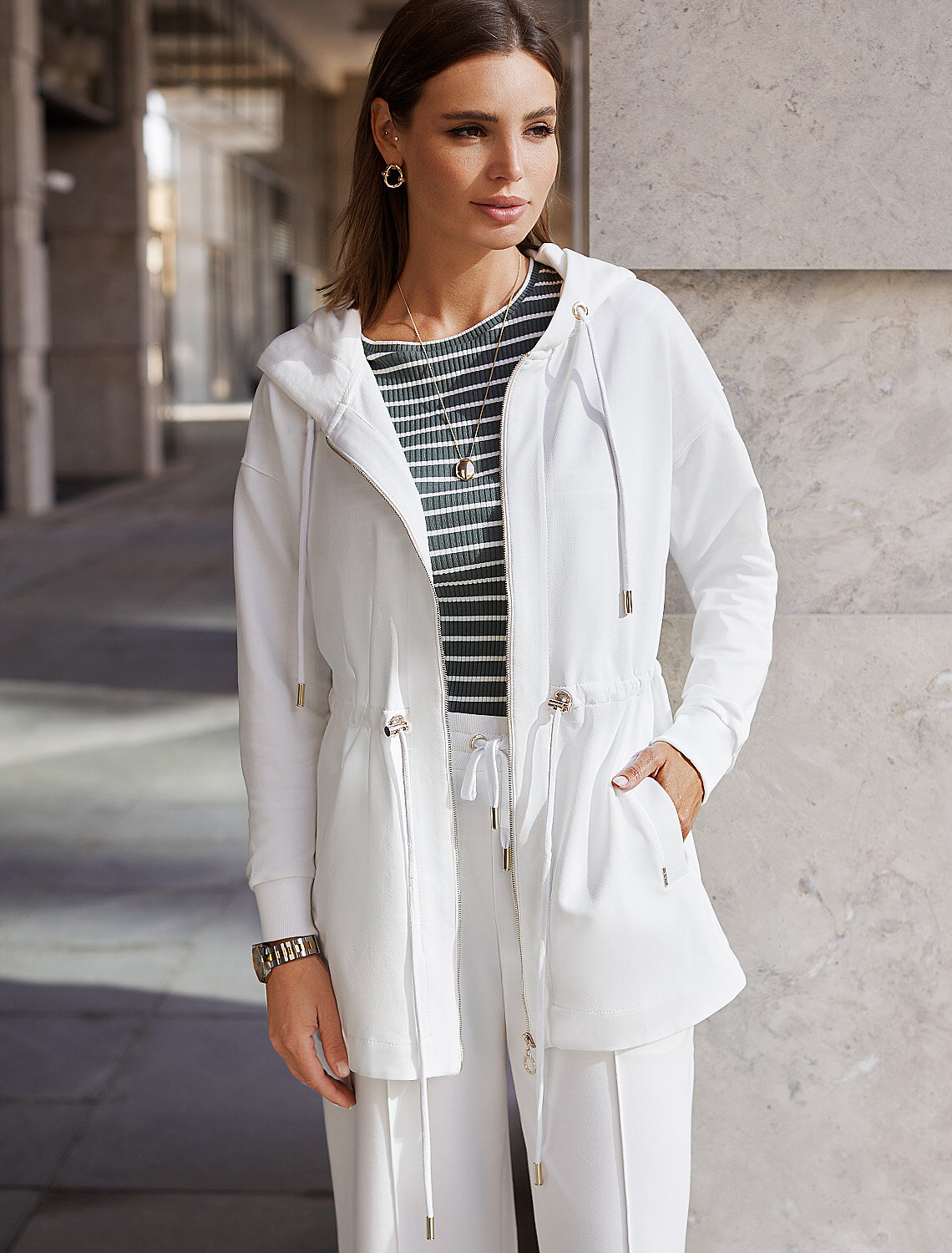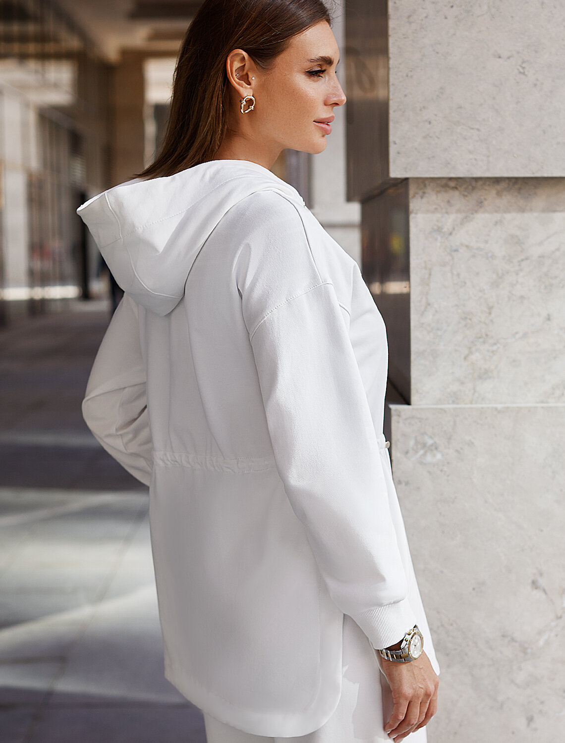 Парка выполнена из эластичного футера двухнитки. Модель дополнена золотистой фурнитурой высокого качества с логотипом бренда. Как у классической модели, изделие с капюшоном, боковыми карманами и регулируемым поясом на хлопковом шнурке. Сочетается в костюме с брюками D44.136, D44.137 и юбкой D46.034