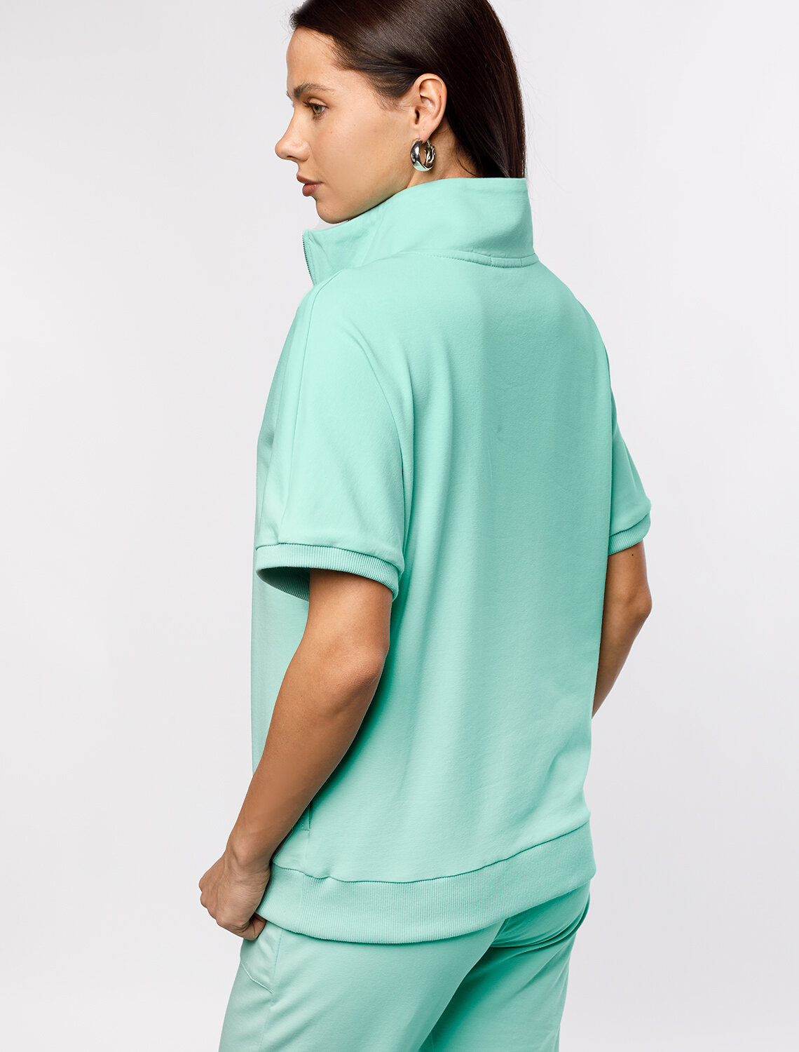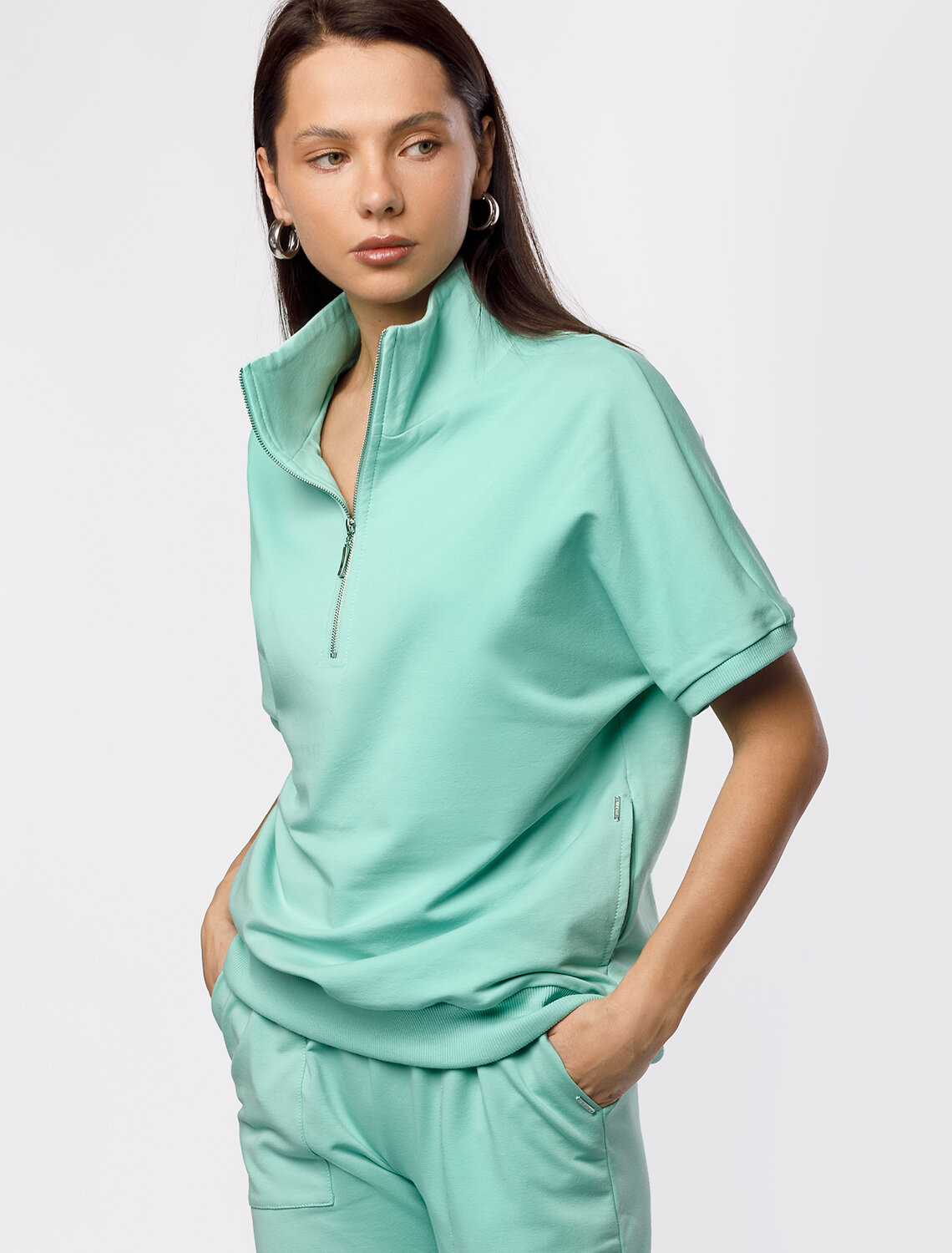 Джемпер среднего объема со спущенным плечом выполнен из футера двухнитки с эластаном. Изделие с воротом на серебристой молнии дополнено боковыми карманами. Эластичный материал гарантирует комфорт и формоустойчивость. Сочетается в костюме с брюками D44.138, D44.139 и шортами D48.008. Изделие дополнено металлическим логотипом бренда.