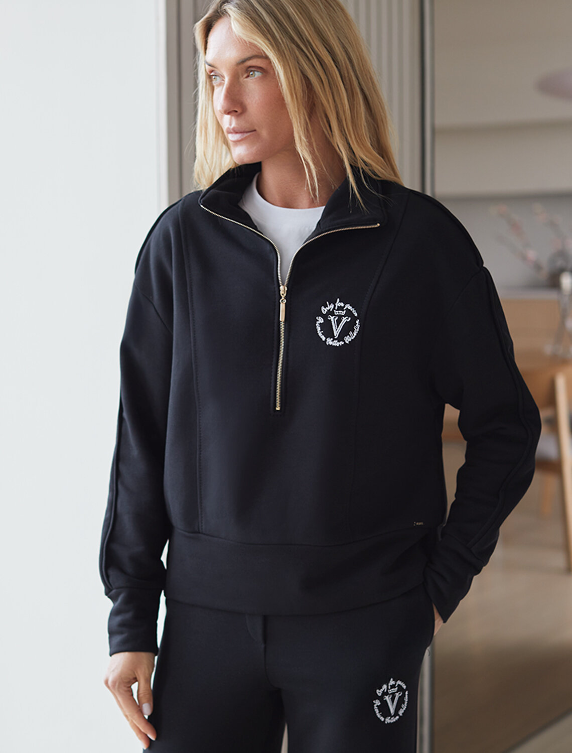 Уютный и комфортный вариант для прохладной погоды – стильный джемпер с воротом на молнии практичного черного цвета. Изготовлен из премиального футера двухнитки с добавлением эластана. Материал сохраняет форму при длительном ношении и после многократных стирок, его мягкая текстура дарит ощущение уюта и тепла.
