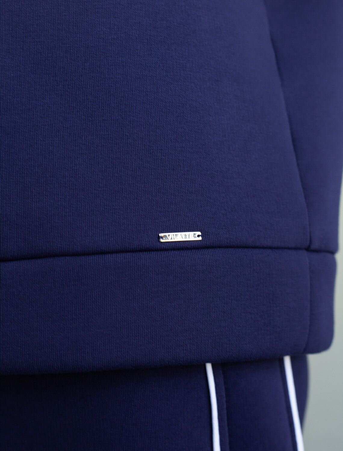 Уютное худи темно-синего цвета с цельнокроенным капюшоном и спущенной линией плеча создано для комфорта в холодную погоду. Модель выполнена из премиального футера трехнитки с мягким начесом, что обеспечивает дополнительное тепло и приятные ощущения при носке. Глубокий капюшон дополнен шнуром для регулировки объема, что обеспечивает отличную защиту от ветра и холода, а серебристая фурнитура добавляет стильный акцент к современному худи. Элементы дизайна — минималистичная вышивка с логотипом бренда и тонкие онтрастные лампасы — делают худи более выразительным без перегруженности деталями, сохраняя эстетичность и современный вид. Эластичные манжеты на рукавах обеспечивают дополнительную защиту от продувания, способствуя сохранению тепла внутри. Натуральный хлопок гарантирует дышащий эффект, позволяя сохранять оптимальный микроклимат тела даже при длительном ношении. Благодаря эластану в составе повседневное худи подходит для активного отдыха, вы будете чувствовать себя свободно в любой ситуации. Представлены бол