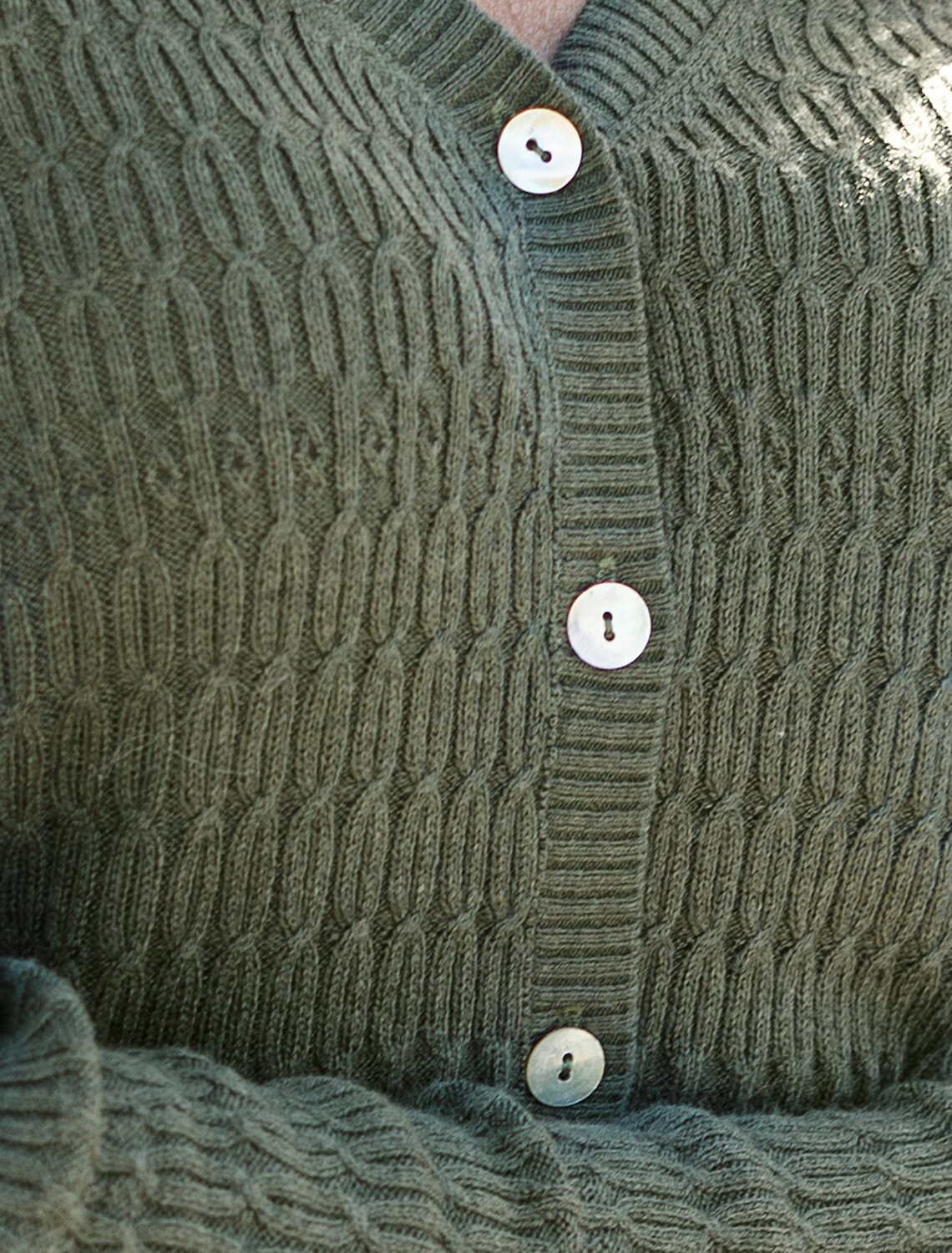 Кардиган тонкой вязки выполнен из хлопка с вискозой. Нежную пряжу, очень приятную к телу, дополняет ажурный узор - плетение косы напоминающий звенья колец. Застежка на пуговицы из натурального перламутра. Модель отлично впишется в весенний и летний гардероб, как самостоятельный верх или накидка на топ или платье. Комфортная длина и крой подходят для любой фигуры.