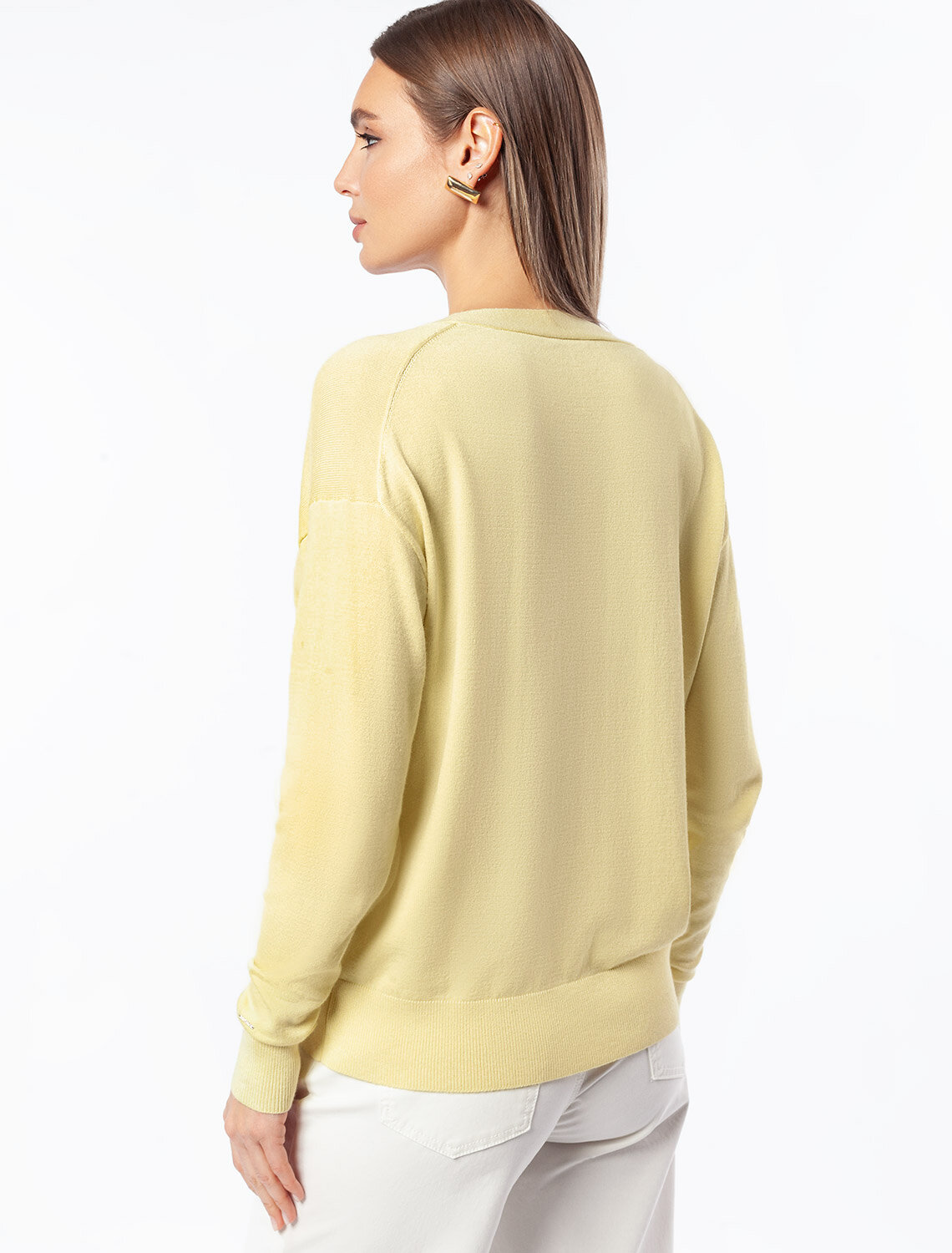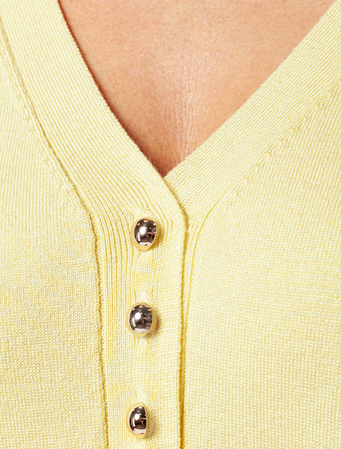 Кардиган тонкой вязки выполнен из нежной пряжи вискозы с нейлоном. Лаконичный силуэт дополнен яркой фишкой изделия - ряд золотистых пуговиц, визуально вытягивающий силуэт. Очень приятное к телу изделие, в котором будет не жарко даже в самые теплые дни. Изделие дополнено логотипом бренда.