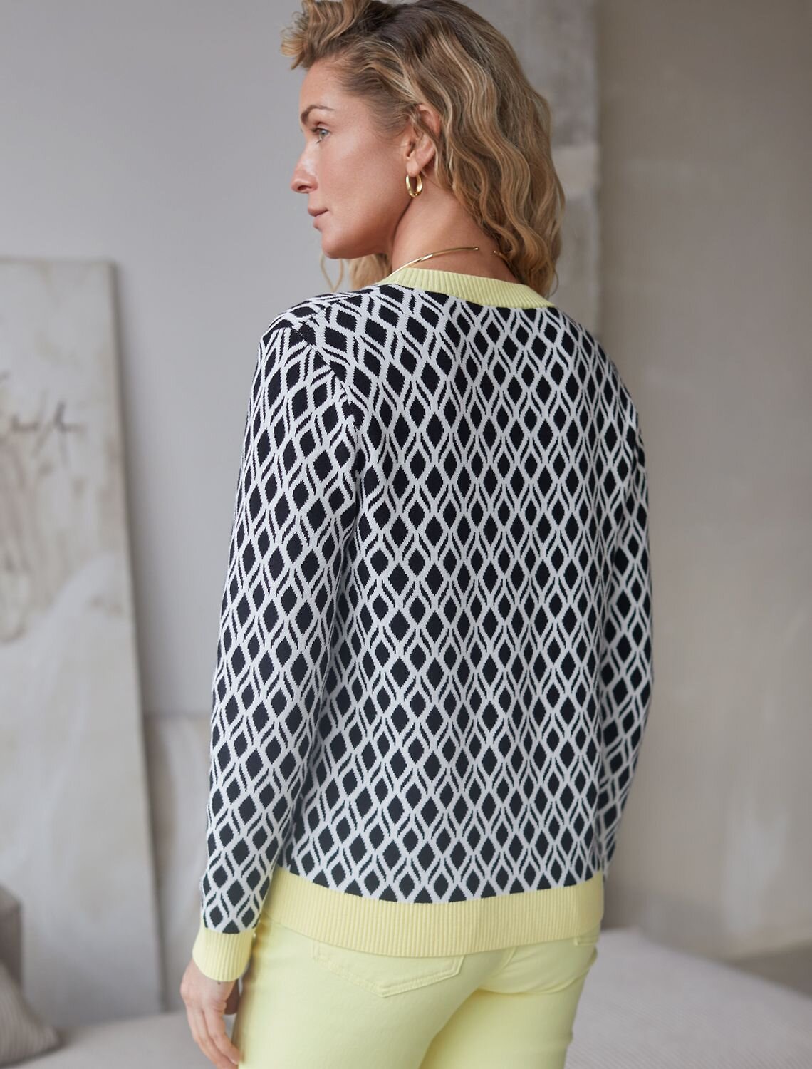 Кардиган с V-вырезом жаккардовой вязки — универсальная и женственная вещь для весны и лета. Бело-черный жакет выполнен из приятной к телу вискозы, отличается в меру свободным кроем, который подчеркивает силуэт. V-вырез подчеркивает зону декольте и визуально вытягивает шею, делая фигуру более изящной. Спущенная линия плеча создает расслабленный силуэт, добавляя комфорта и свободы движений, что отлично подойдет для девушек и женщин плюс сайз размеров. Модель на пуговицах обеспечивает удобство в носке и добавляет классическую нотку образу. Контрастная отделка гармонично сочетается с выразительным геометрическим рисунком, который придает образу индивидуальность и современность. Принт немного напоминает благородный орнамент аргайл, Карманы-обманки украшают, сохраняя лаконичность внешнего вида, Кардиган средней длины оптимален для создания разных комбинаций на каждый день. Такой жакет легко впишется в офисный или повседневный образ благодаря своей универсальности и современному стилю. Вискоза дарит ощущение комфорта даже в теплую погоду, а качественная жаккардовая вязка сохраняет форму после стирки.
