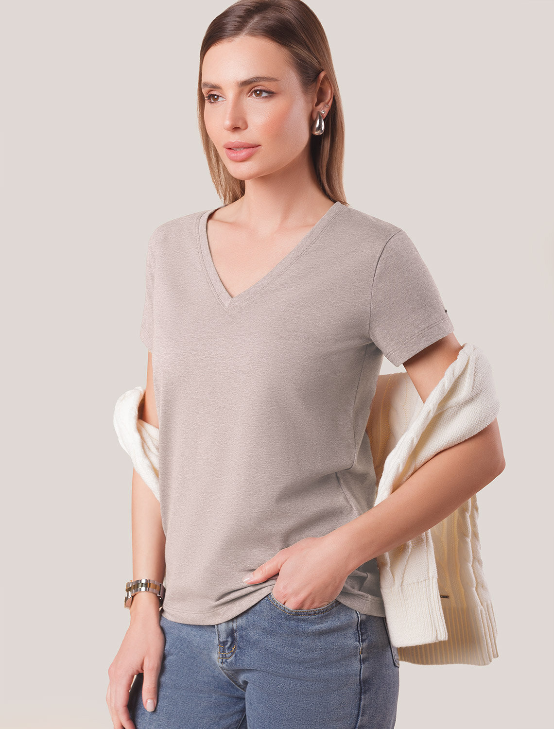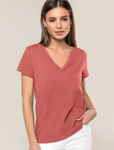 Однотонная футболка с V-образным вырезом выполнена из премиального хлопка. Добавление эластана в состав изделия способствует формоустойчивости. Самое высокое качество длинноволокнистых хлопковых волокон обеспечивает комфорт в любое время года.Универсальная базовая будет уместна не только в повседневном образе с денимом, но и в офисе с нестрогим дресс-кодом, в паре с брюками и жакетом.