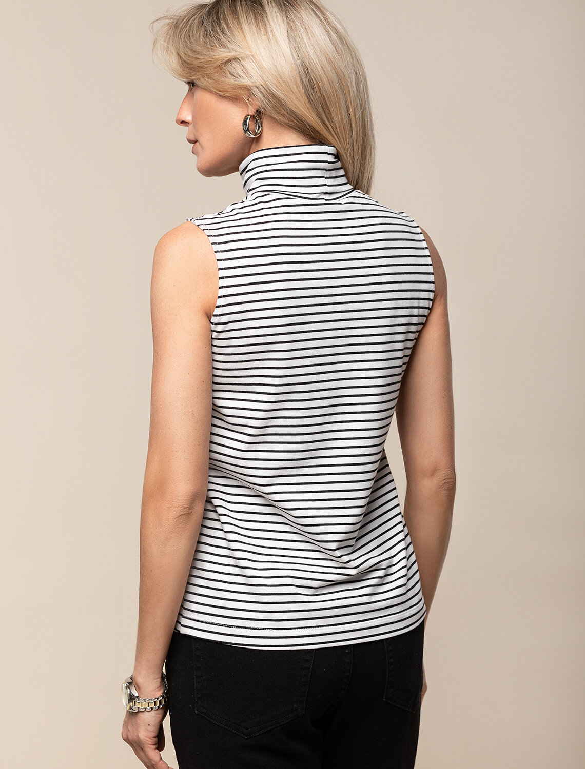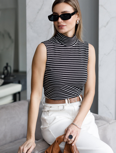 Топ с воротом как у водолазки выполнен из премиального хлопка. Наличие эластана в составе изделия способствует формоустойчивости. Модель хорошо будет сочетаться в комплекте с жакетом или кардиганом, так как отсутствие рукавов позволит комфортное использование в многослойных образах. Из украшений металлический логотип бренда.
