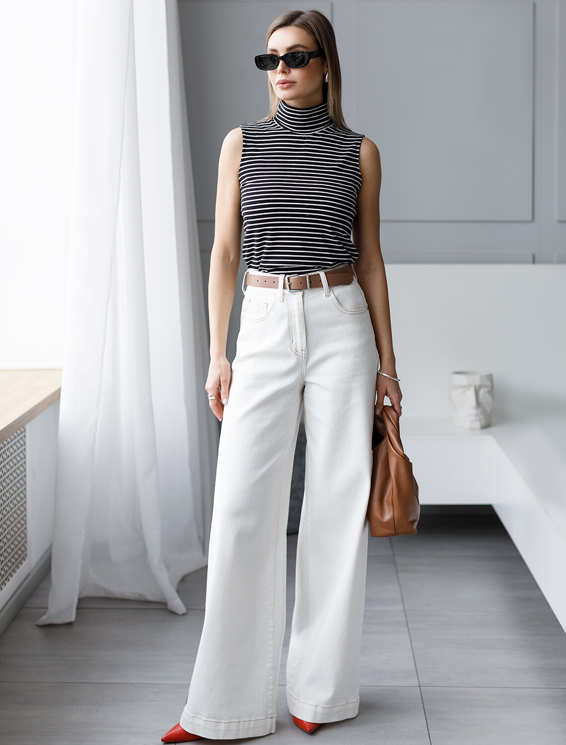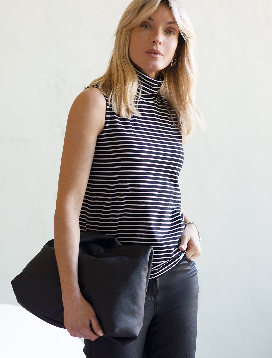 Топ с воротом как у водолазки выполнен из премиального хлопка. Наличие эластана в составе изделия способствует формоустойчивости. Модель хорошо будет сочетаться в комплекте с жакетом или кардиганом, так как отсутствие рукавов позволит комфортное использование в многослойных образах. Из украшений металлический логотип бренда.