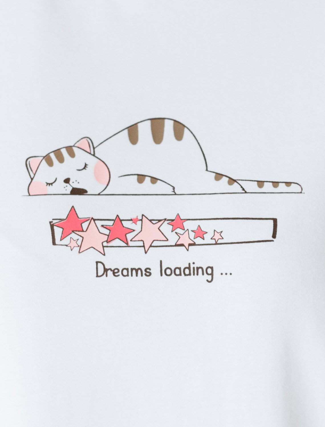 Особое внимание привлекает стильный принт в виде спящего кота с надписью, перевод надписи Dreams loading - Загрузка снов. Принт выполнен красками с устойчивым покрытием, который добавляет изделию оригинальности и позволяет выразить индивидуальность.
