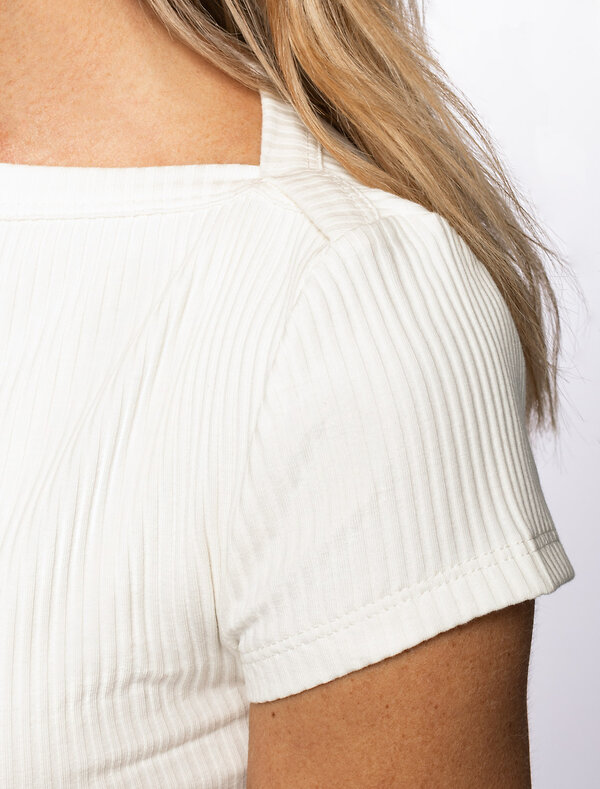 Футболка выполнена из фактурного трикотажа в широкий рубчик. Модель с трендовым коротким рукавом и горловиной формы лодочка. Эластичный материал безупречно сидит по фигуре не сковывая движений. Впишется в любой гардероб. Изделие дополнено металлическим логотипом бренда.
