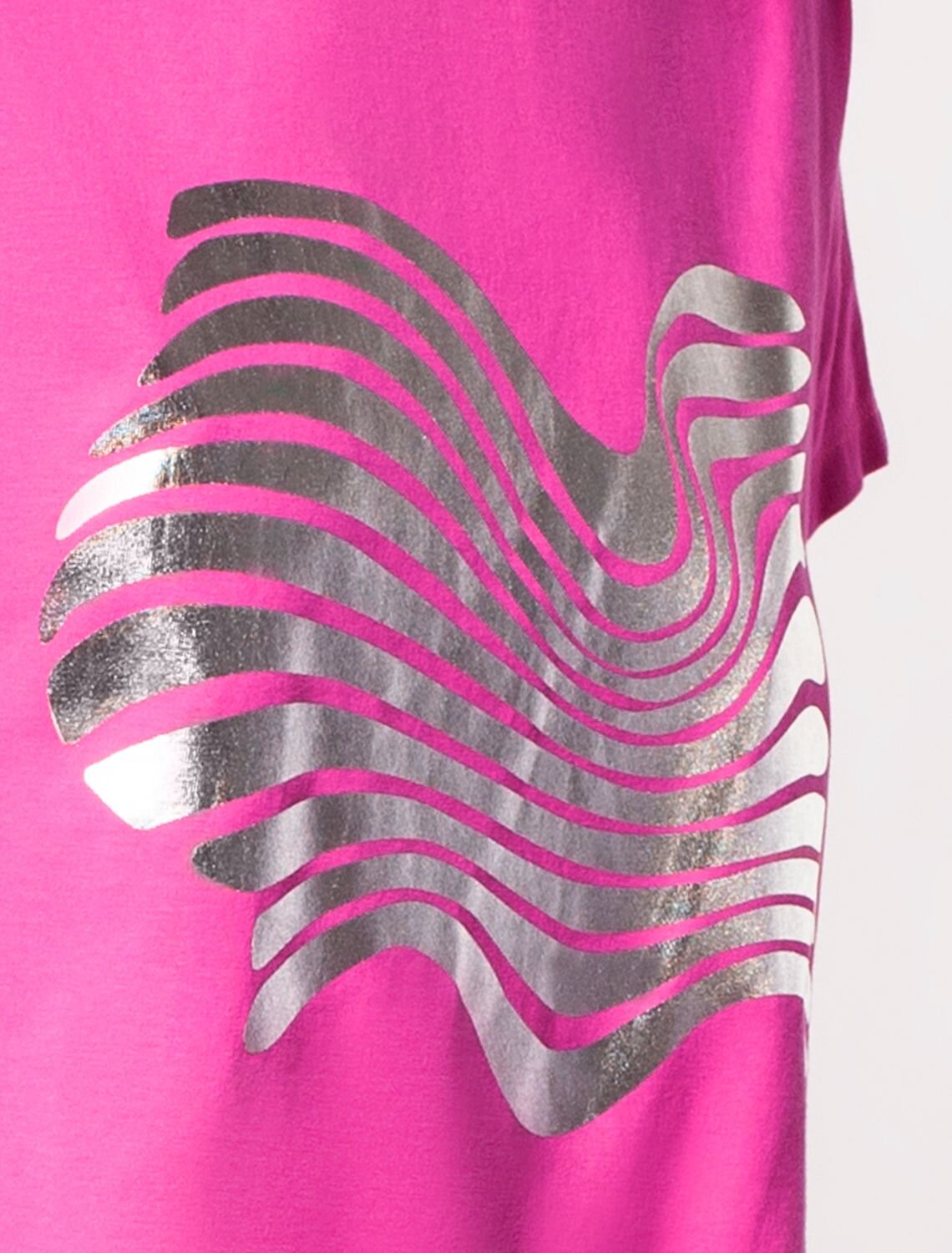 Футболка с цельнокроеным рукавом выполнена из премиального хлопка с принтом фольгой. Изделие украшено металлическим логотипом бренда. Самое высокое качество хлопковых волокон с добавлением эластана. Идеально держит форму и сохраняет внешний вид в течение долговременного использования.
