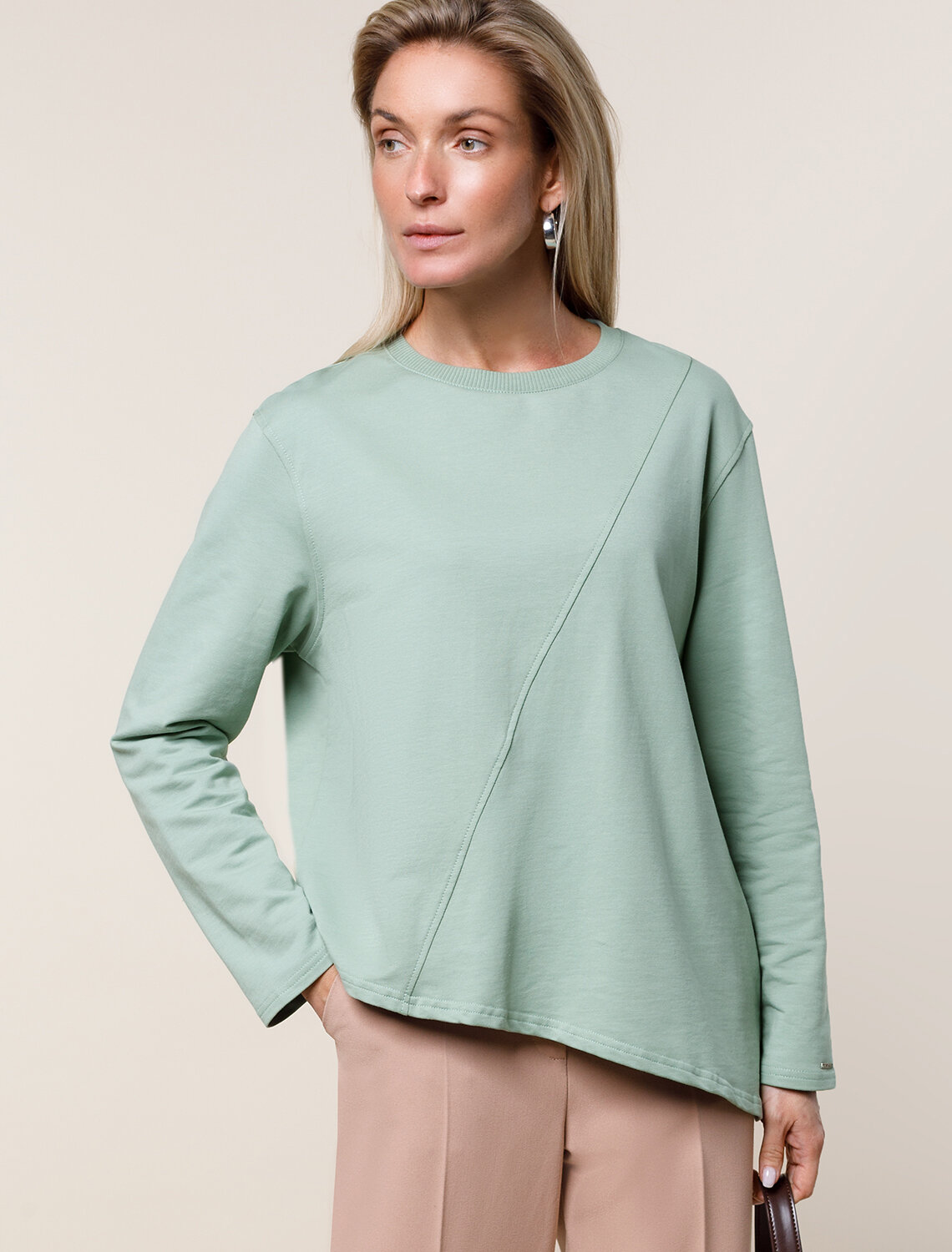 Ассиметричный джемпер выполнен из премиального футера двухнитки. Спущенная линия плеча поддерживает расслабленный образ, который особенно хорошо будет сочетаться в костюме с брюками D44.122, D44.123 и D44.128. Наличие эластана в составе изделия гарантирует идеальную посадку и комфорт.
