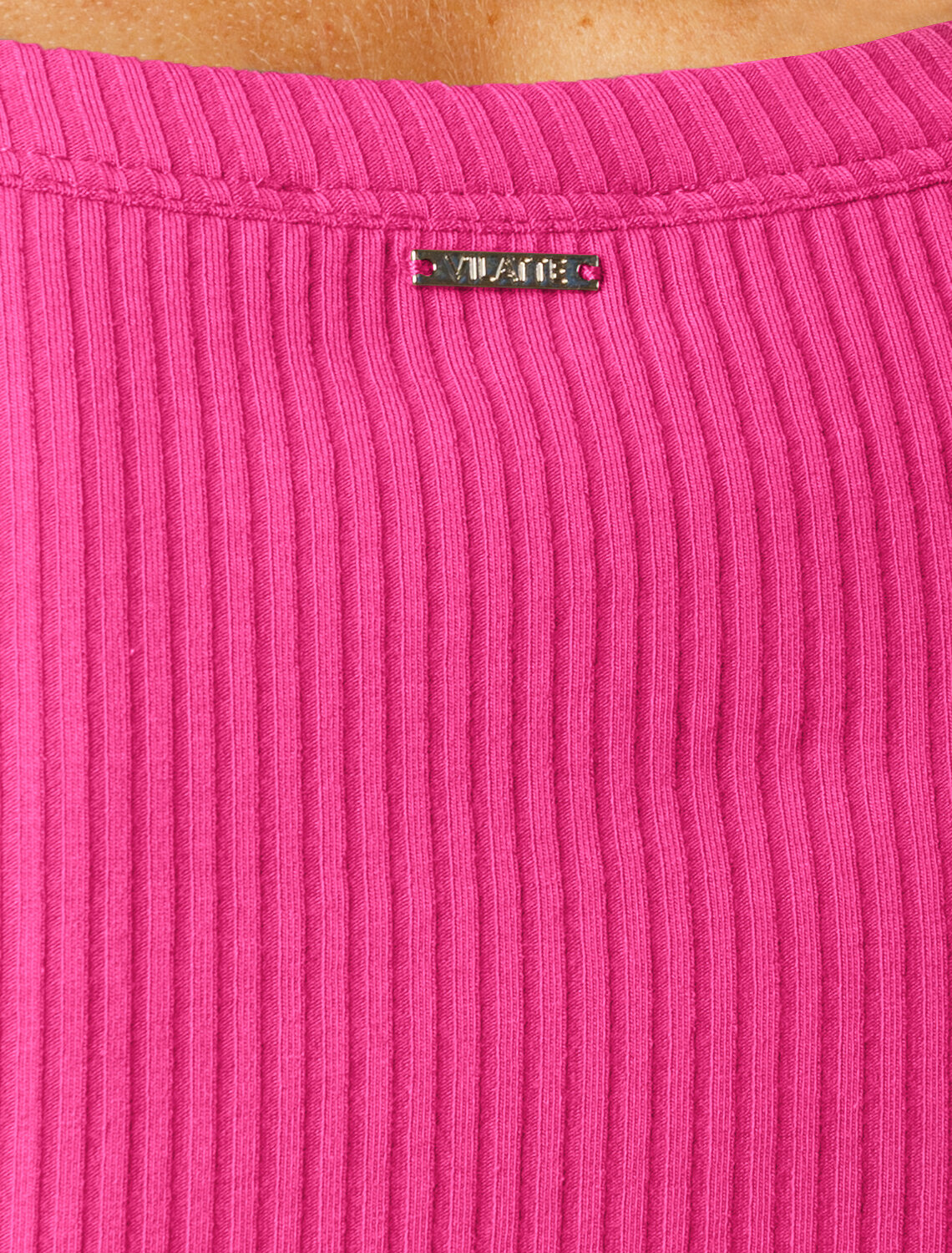 Футболка выполнена из трикотажа в широкий рубчик. Модель с круглым вырезом. Эластичный хлопковый трикотаж сидит по фигуре, не сковывает движений и очень комфортный в носке. Фактура вертикальных полос визуально стройнит и вытягивает силуэт. Базовое изделие хорошо впишется в любой гардероб. Идеально подходит для многослойных образов.