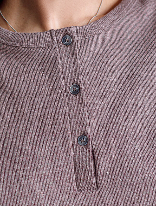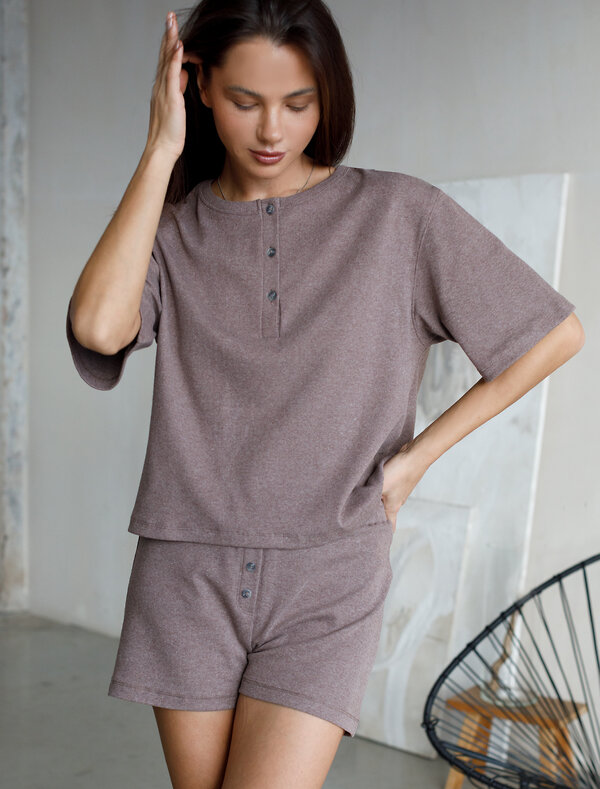 Футболка выполнена из фактурного трикотажа в рубчик. Модель свободного кроя дополнена пуговицами с логотипом бренда. Благодаря мягкой хлопковой ткани в рубчик, футболка очень приятная к телу. Эластан в составе гарантирует комфорт и формоустойчивость изделия. Сочетается в костюме с шортами D48.007 и брюками D44.121