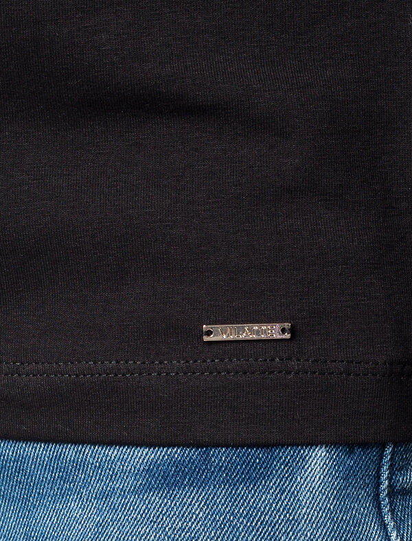 Черный джемпер с длинными рукавами и V-образным вырезом сшит из премиального хлопка. Однотонная хлопковая модель хорошо поддерживает комфортный для тела микроклимат. Благодаря вплетению эластановых волокон вещь хорошо сохраняет форму.