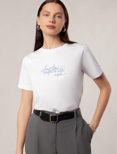 Перевод принта: Look on the bright side - смотри на жизнь позитивно. Футболка выполнена из премиального хлопка. Авторский принт нанесен фактурными красками с устойчивым покрытием. Наличие эластана в составе гарантирует комфорт и формоустойчивость. Изделие дополнено фирменным металлическим логотипом бренда.