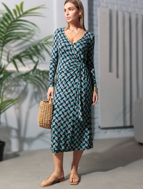 Платье на запАх сшито из трикотажной вискозы с эластаном. V-вырез с мини-копкой на борте с внутренней стороны для фиксации выреза декольте. Запах сходится и завязывается на боковой-пояс ленту. Модель подчеркивает достоинства и изгибы фигуры. А геометрический принт скрывает любые неровности. Роскошь и комфорт, одновременно подчеркивающие стиль, женственность и красоту.