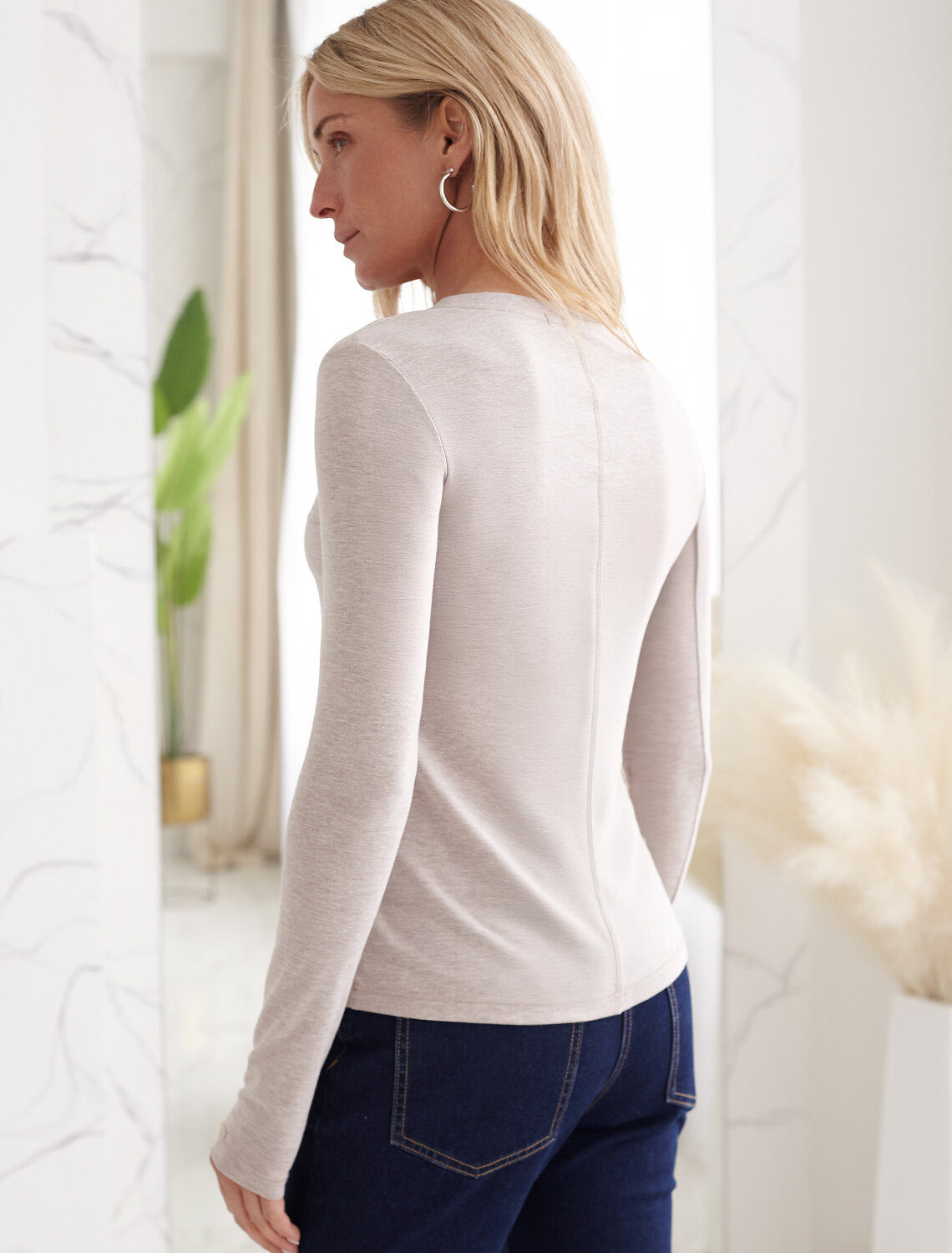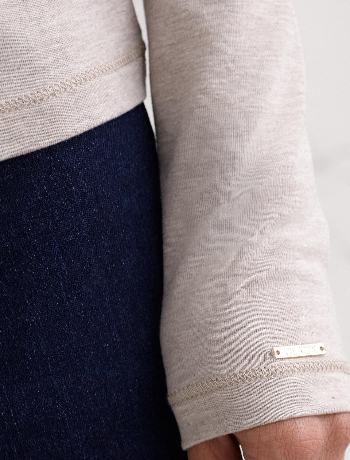 Лонгслив выполнен из премиального хлопка с эластаном. Модель прилегающего силуэта идеально сидит по фигуре. Хорошо подойдет первым слоем в многослойные образы. Фишкой изделия служат декоративные швы и фирменный металлический логотип бренда на рукаве.