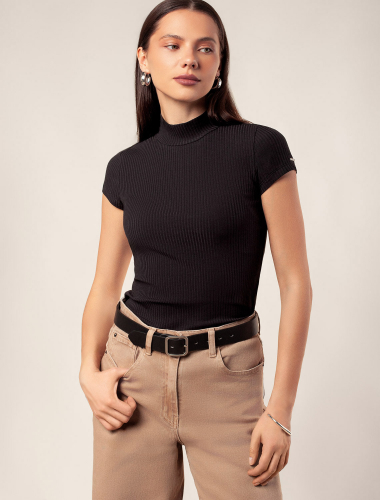 Футболка с воротом стойка выполнена из фактурного трикотажа в рубчик. Модель идеально сидит по фигуре не сковывая движения. Хлопковый трикотаж поддерживает оптимальную температуру тела, поэтому в изделии будет комфортно в течении всего дня. Наличие эластана в составе гарантирует формоустойчивости. Базовая модель впишется в любой гардероб и подойдет для офисного дресс-кода.