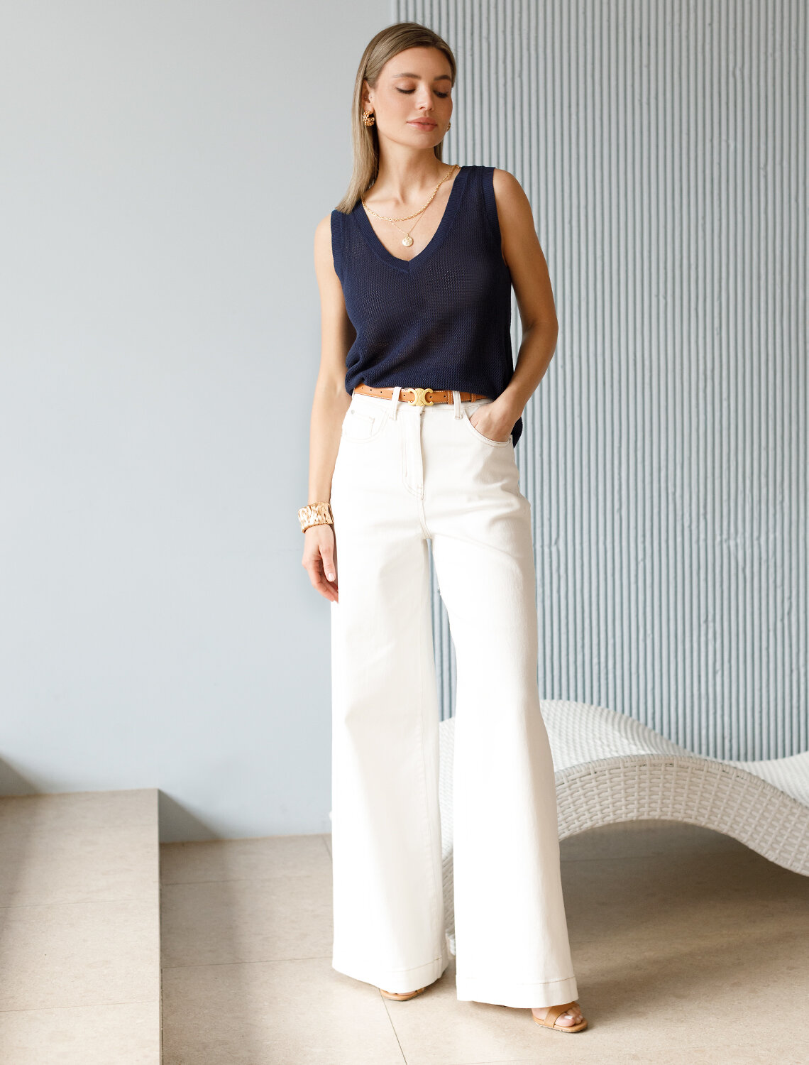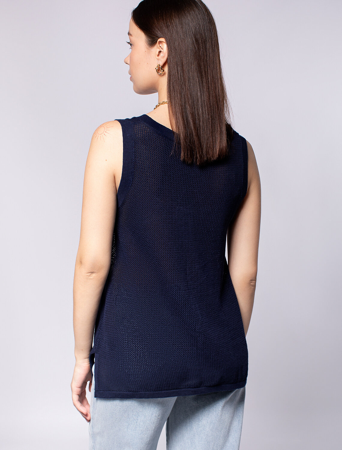 Летний топ полупрозрачной вязки выполнен из хлопковой пряжи. Идеально подойдет в жару, с мини-топом или в сочетании с купальником. Также отлично впишется в многослойные образы с джинсами и жакетом. Модель дополнена металлическим логотипом бренда.