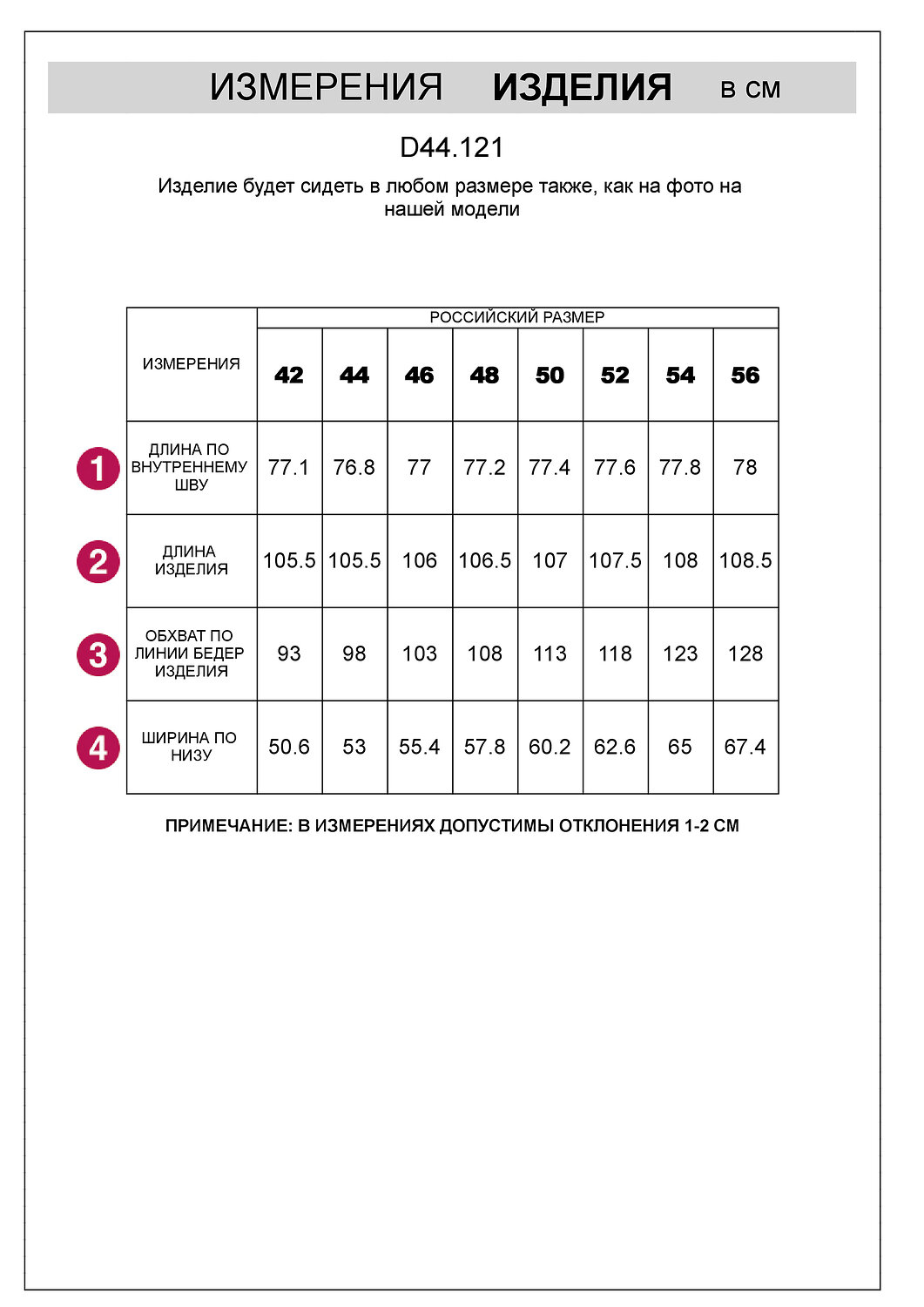 Брюки прямого кроя выполнены из фактурного трикотажа в рубчик. Благодаря мягкой хлопковой ткани в рубчик, брюки комфортно сидят по фигуре и не будет стеснять движения. Эластан в составе гарантирует формоустойчивость изделия. Сочетаются в костюме с топом D43.183, футболкой D49.005 и лонгсливом D49.012