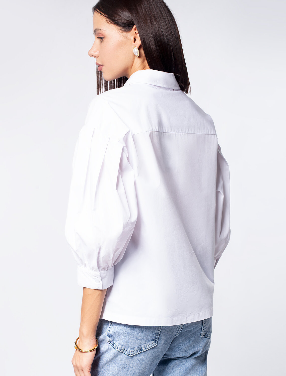 Блузка выполнена из премиального поплина из 100% хлопка. Укороченная модель с рукавами-фонариками одинокого хорошо будет смотрятся на выпуск или в заправку. Оптимальная длина изделия позволяет составить образы в расслабленном стиле.