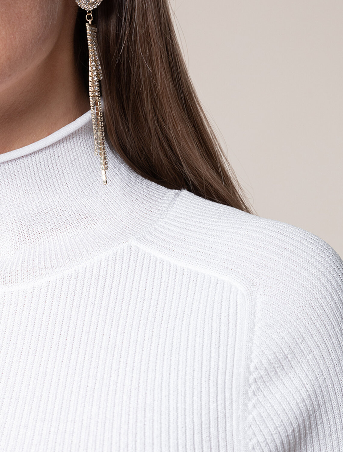 Свитер фактурной вязки выполнен из эластичного трикотажа на основе вискозы. Добавление в состав пряжи мягкого люрекса создает праздничное сияние. Изюминка модели – контрастное сочетание на манжетах и по нижнему краю. Идеально сидит по фигуре, подчеркивая силуэт. Изделие не колется и комфортно в носке даже на голое тело. Дополнительным украшением служит металлический логотип бренда.