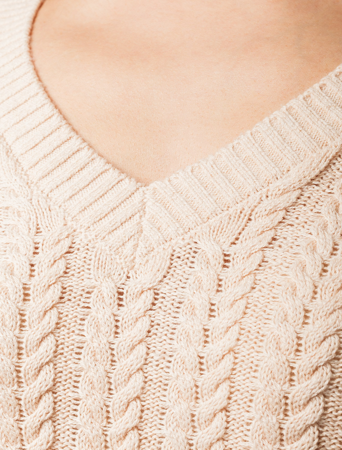 Джемпер фактурной вязки выполнен из хлопка с добавлением кашемира. Модель с V-вырезом с вывязанным орнаментом цепи. Мягкая и очень приятная пряжа совершенно не колется, сохраняет тепло при этом не перегревая, гарантируя безупречный комфорт.