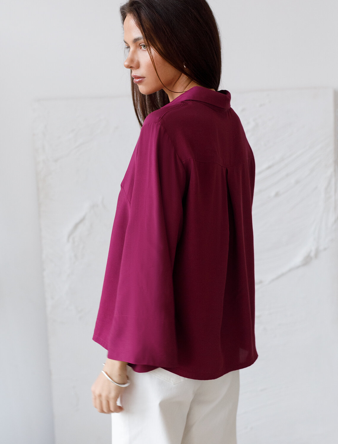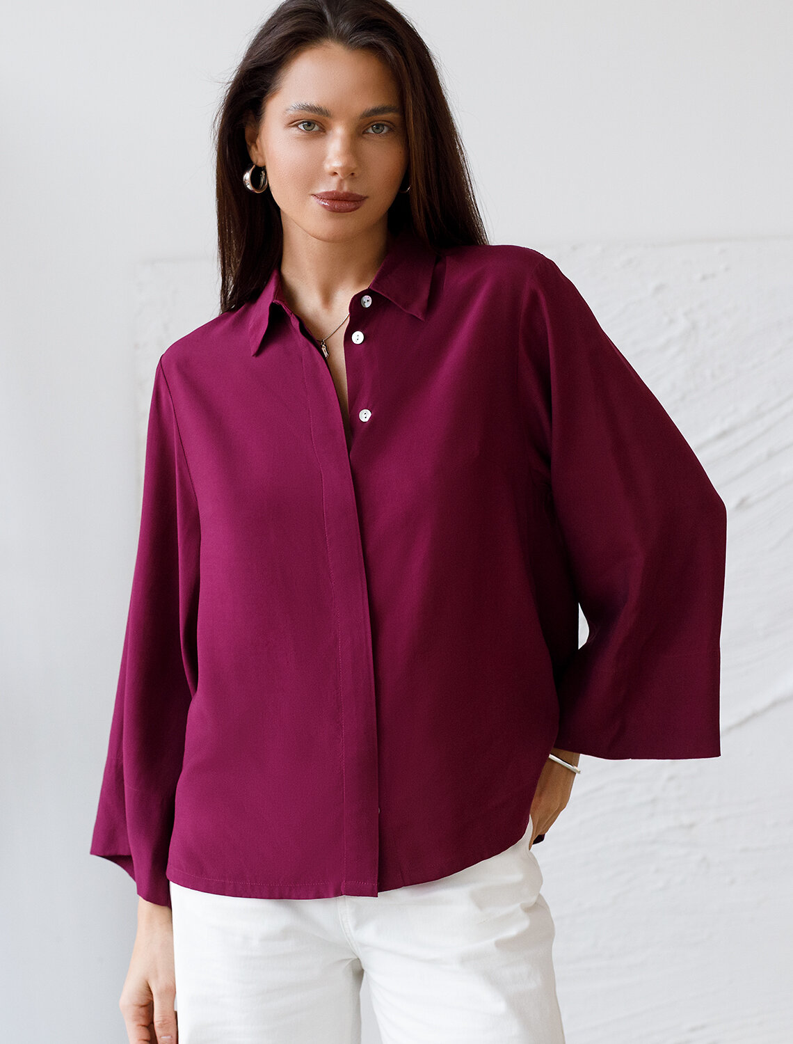 Блузка с отложным воротником и свободными укороченными рукавами выполнена из лиоцелла с вискозой. Лаконичная модель без декора, дополнена застежкой на пуговицы из натурального перламутра под планкой. Просторный крой не стесняющий движений подходит для любой фигуры с не широкими низами в заправку или поверх.
