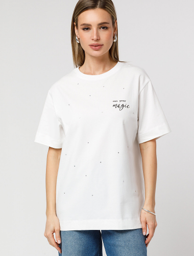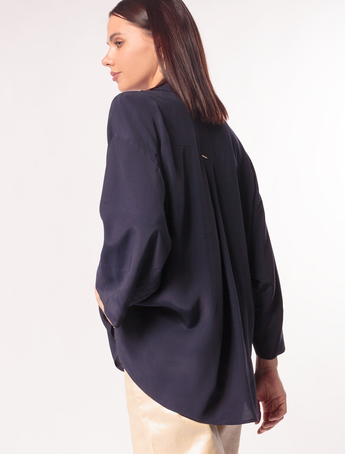 Удлиненная блузка свободного кроя выполнена из премиальной вискозы и лиоцелла. Застежка на пуговицы из натурального перламутра. Приятная на ощупь ткань охлаждает кожу в жаркую погоду. Отлично впишется в нестрогий офисный дресс-код или в расслабленном повседневном образе с джинсами и юбками. На спинке фирменный логотип бренда.