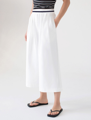 Свободные брюки прямого силуэта выполнены из эластичного футера двухнитки. Длина изделия до щиколотки. В боковых швах расположены карманы. Внутренняя часть кармана из тонкого хлопка в тон полотна. Модель дополнена эластичным поясом, с контрастной полосой и золотистым логотипом бренда. Сочетается в костюме с джемпером D49.083 и D49.086