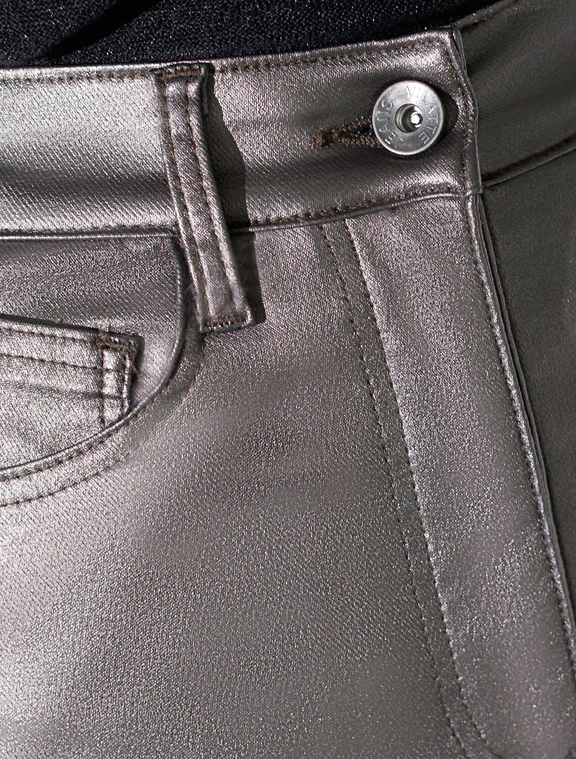 Прямая юбка черного цвета с темно-серебристым металлизированным покрытием средней длины создает эффектный образ, визуально вытягивает силуэт и подчеркивает стройность фигуры. Разрез внизу придает дополнительную свободу движений и делает образ еще более привлекательным, а металлический мягкий блеск добавляет изящества и современности. Юбка отлично смотрится как на маленьких, так и на больших размерах благодаря продуманному крою и качественному эластичному материалу. Мягкая структура ткани обеспечивает комфорт даже при длительном ношени и приятные тактильные ощущения, сохраняет форму после стирок.